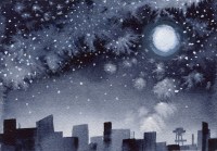 Night Lights — Sky Demo 3 Published February 1, 2014 at 969 × 674 in Technique of the Week — How to be a Watercolour Wizard ← Previous Next → “Night Lights” — the background nebula-like blooms of sky colour are salt; the individual stars are dots of white ink.