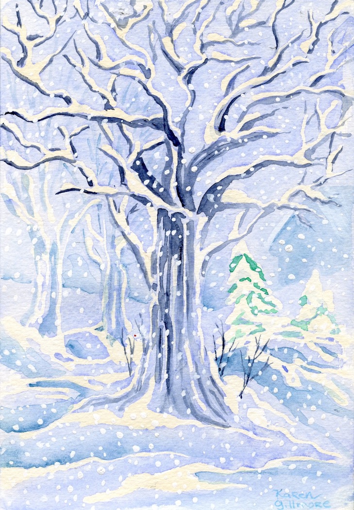 “Winter Tree” — a Christmas card I did for a friend; the white was all masked off with masking fluid, after which I could paint freely, knowing all that lovely snow would be preserved in pristine white paper.