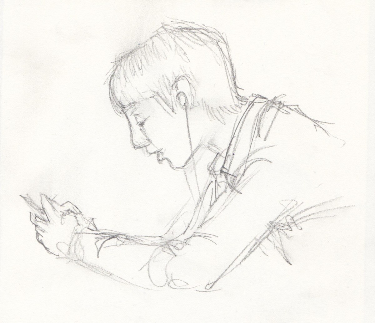 Boy texting Published February 18, 2014 at 2309 × 1987 in Practice, Practice, Practice! — Achieving right-brain bliss through figure drawing ← Previous Next → Boy texting — this young man was so engrossed that he barely moved during the time I took to sketch this, about five minutes.
