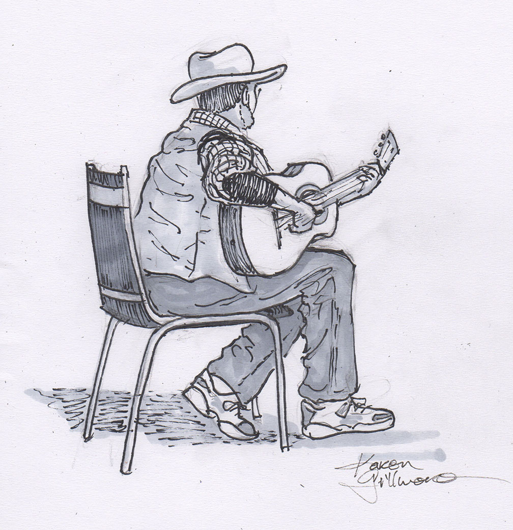 Mike playing guitar — Last night my band went to a concert up in Nanaimo, about a two hour drive from Victoria. Our friends, who are in a band called “Bob”, were playing at the local folk club. We played a few songs on the open stage, then I settled in to sketch my friends. However, I was seated at the very side, and the only member of Bob that I could see well enough to sketch was Mike. It’s a real challenge to sketch people who are moving around, and while there are some kind of strange things about this drawing, Mike liked it and gave me permission to post it!