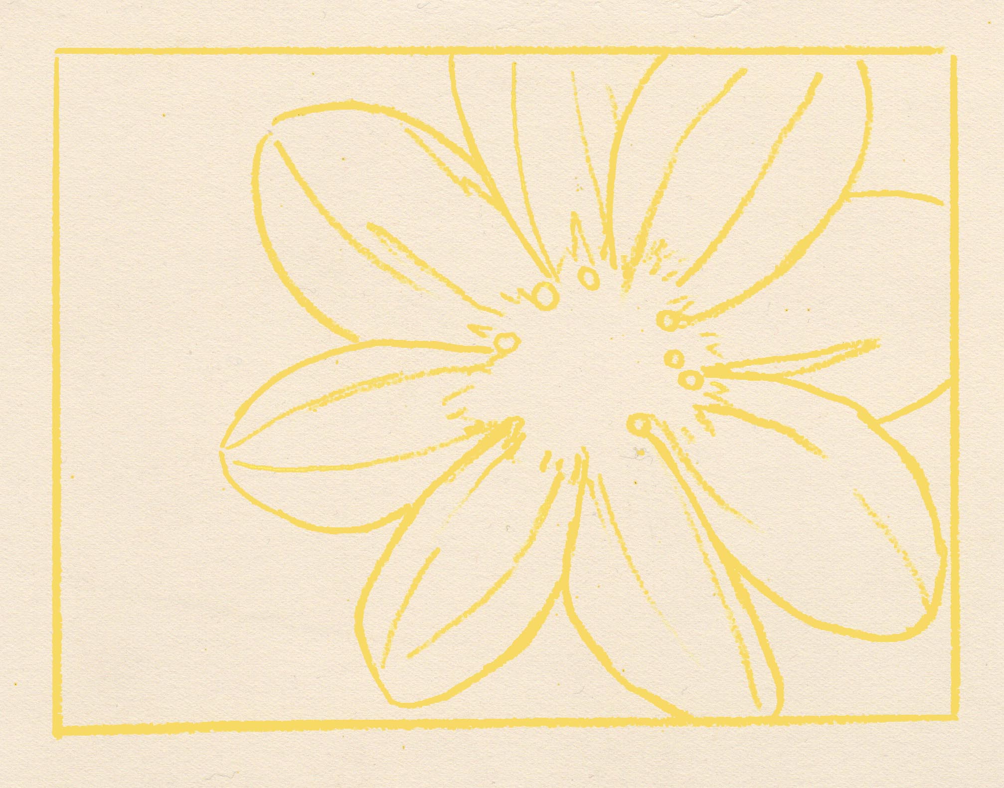 I started off with a drawing in yellow pencil, since that was going to be an underlying colour through most of the flower. Regular graphite pencils can smudge and cause your colours to get greyed wherever they connect. Pick a very light colour to sketch in, that will show up in most of your painting. You may need to use different colours for different areas. I photoshopped this a bit so it would show up more clearly; it was very pale.