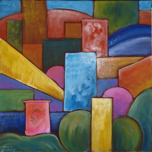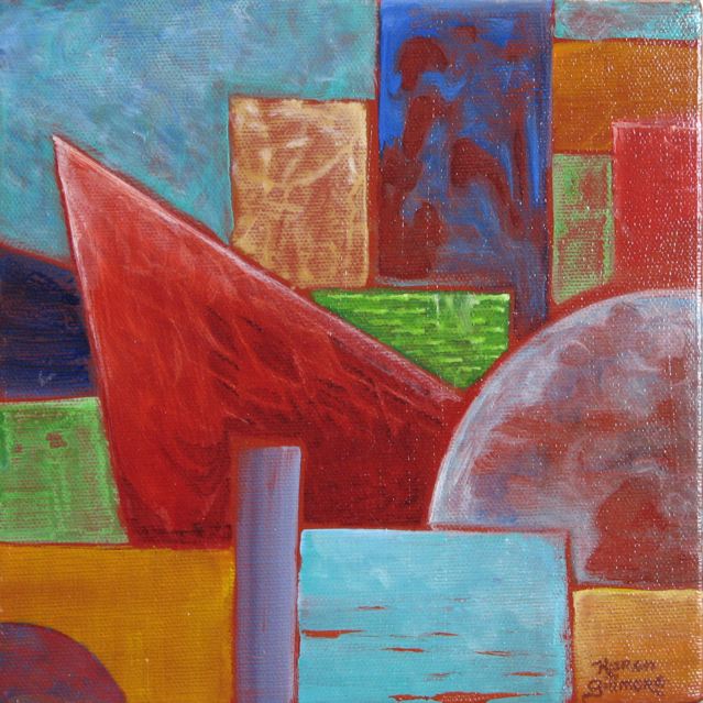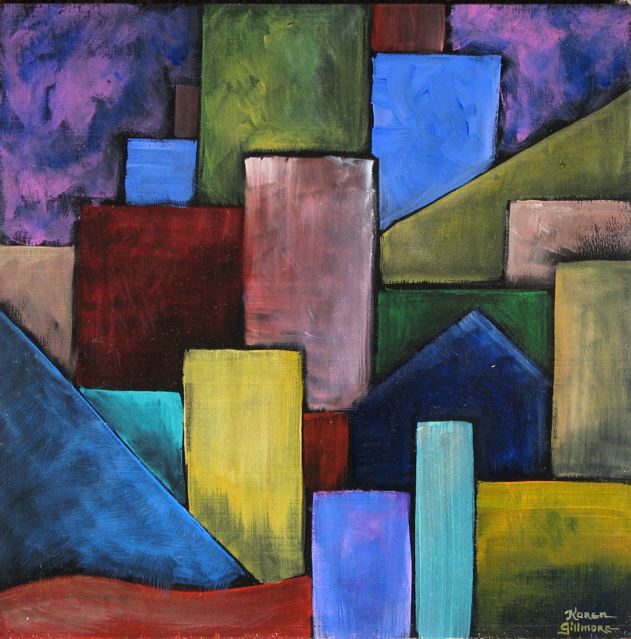 I started out making some random brushstrokes, just playing with colour and shapes, smoodging (technical term!) around the paint, and eventually ended up with a collection of futuristic city paintings. It was great fun! They are all quite small: either 12×12 inches or 8×8 inches.