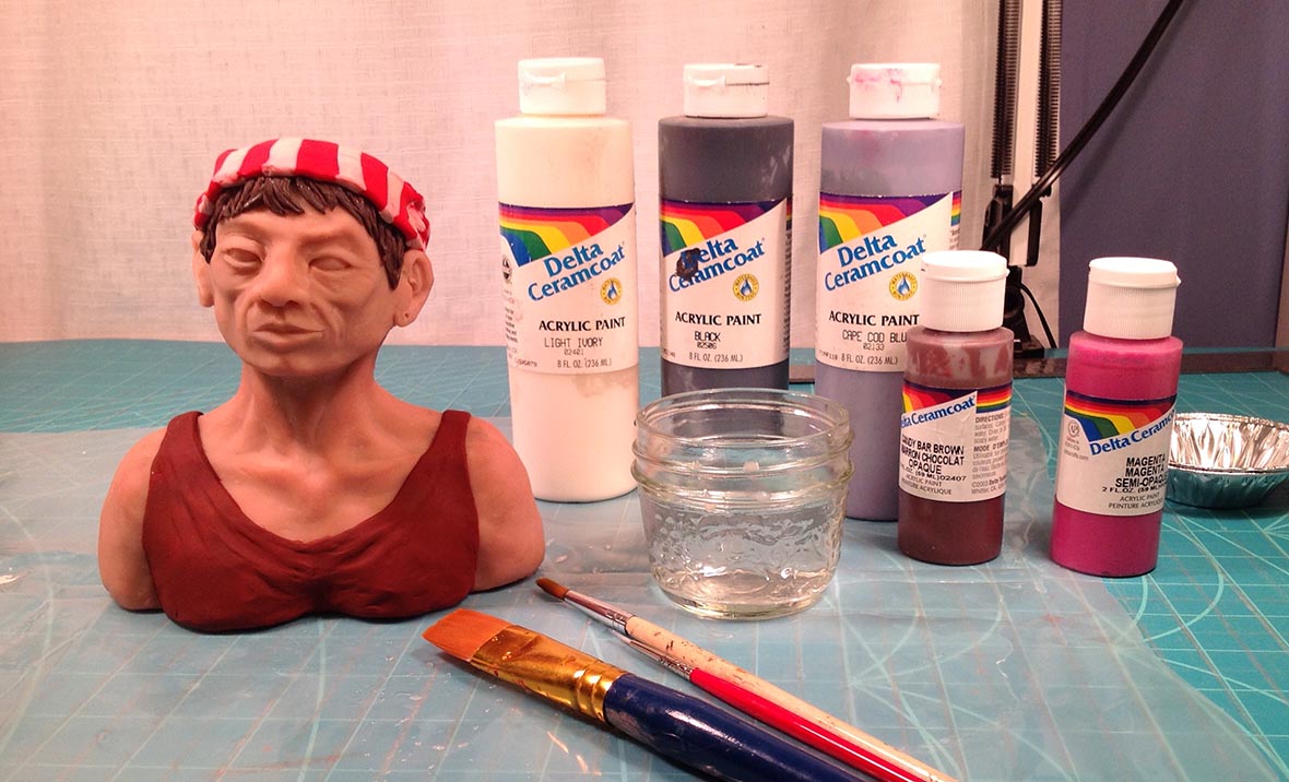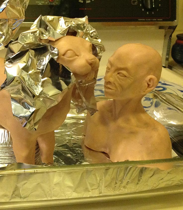 Like all my character maquettes so far, I started her with an armature of wire for stability and aluminum foil for bulk, covered with Super Sculpey polymer clay. I don’t know why I don’t have any pictures of her in her building stages, but I do have one picture of her about to go into the oven with Spam for her initial firing — she looks a bit like Jean Luc Picard from Star Trek Next Generation! At this point I had not year put her hair and clothing on her. I wanted to try using coloured clay for that instead of the pinkish-brown Super Sculpey, which works well for lighter skin tones, but has to be painted for any other colour.