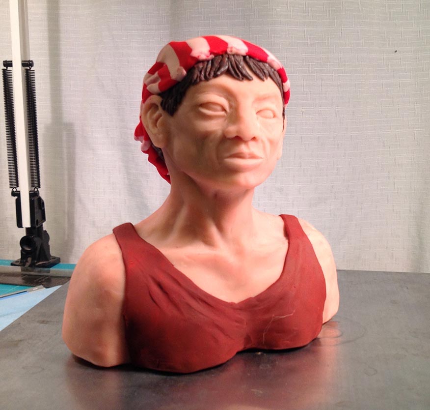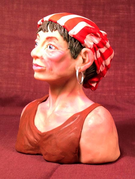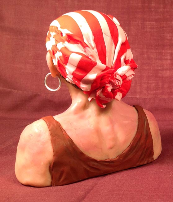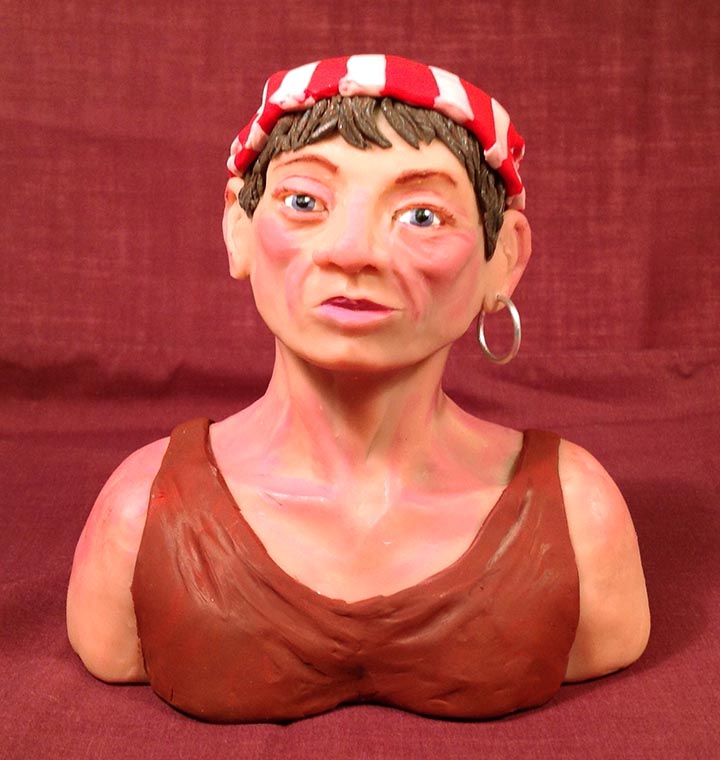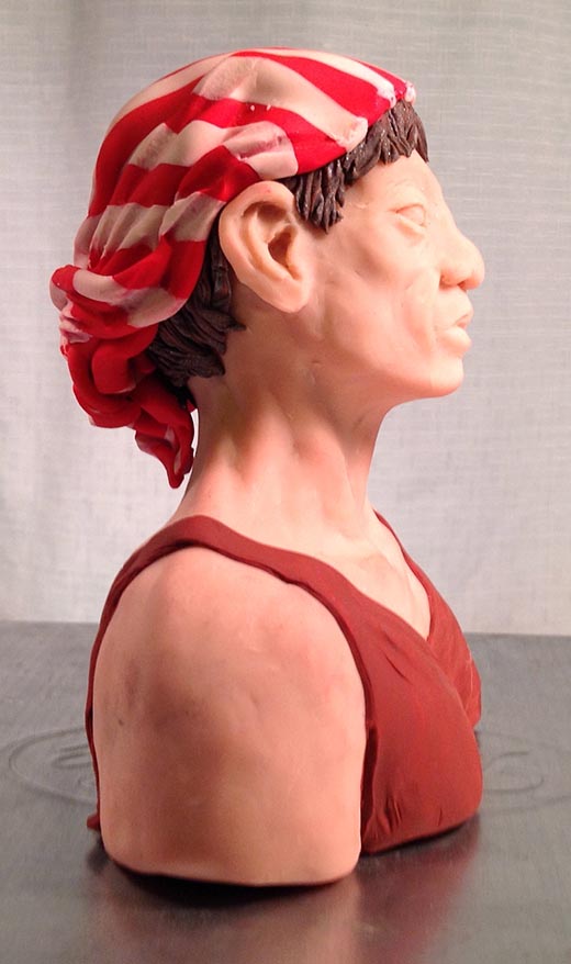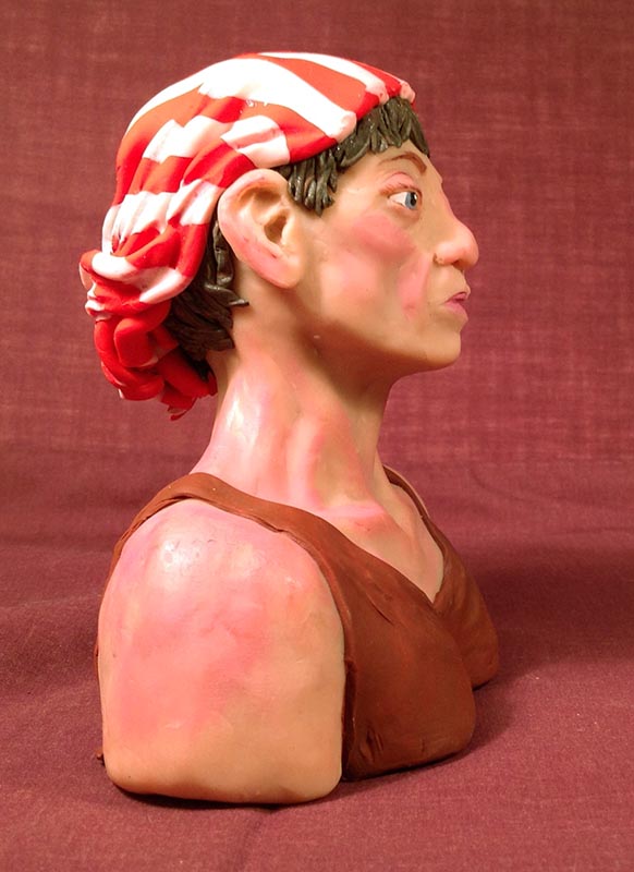 Then I had fun rolling out the coloured clay to make her shirt and her bandana, and rolling really skinny worms blended from brown and silver for her hair, which I attached to her head (before the bandana) and then added further shaping with a tool.