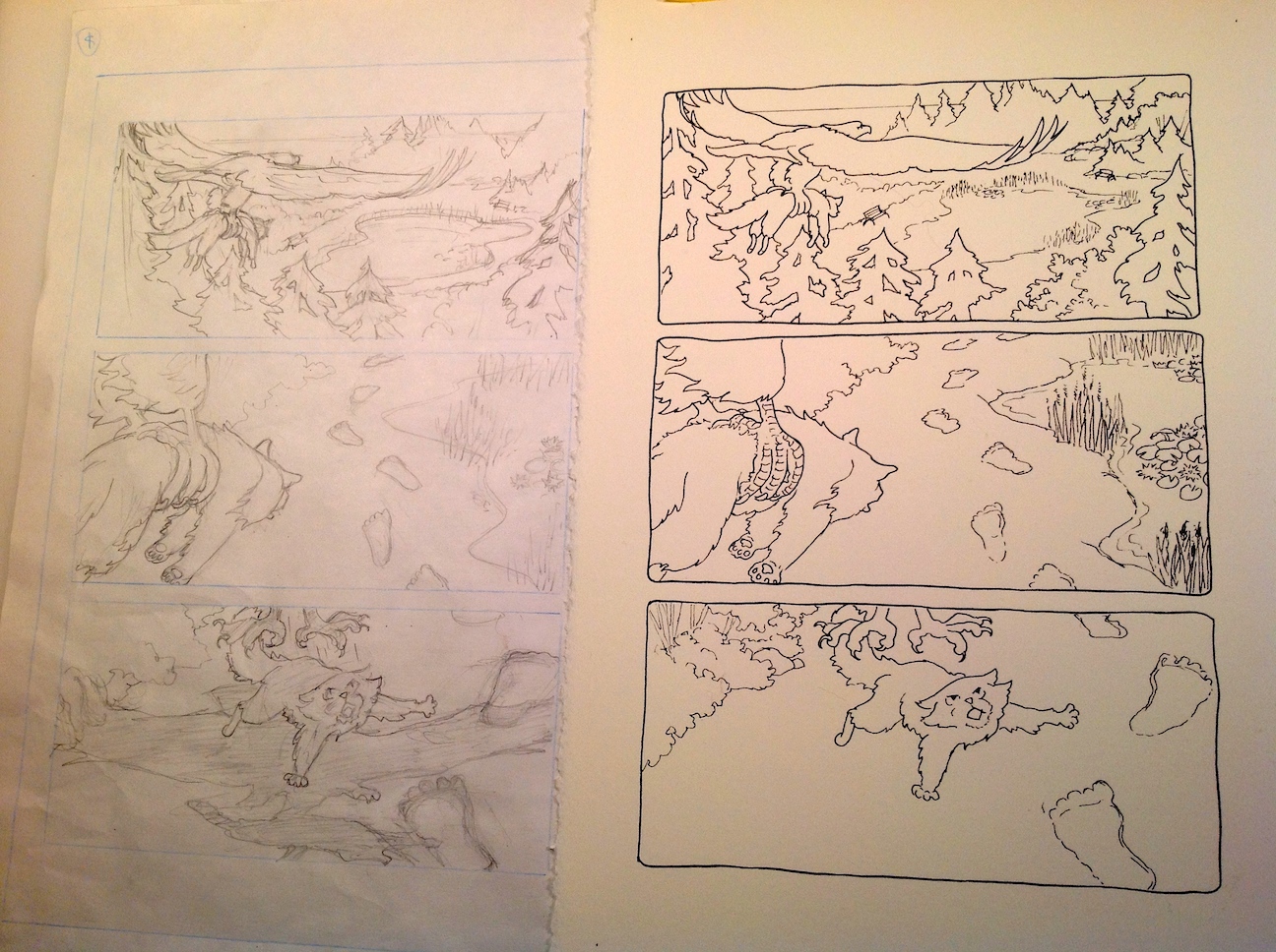 Today I managed to ink 8 pages — I’m feeling pretty smug, and also relieved — Until I tried it, I wasn’t sure if this method was going to be significantly faster, or slower, and I am working to deadline. The ease of this method means I should have a reasonable amount of time for the painting part (these will be done in watercolour). The final stage will be cleaning up anything that needs it in Photoshop, then laying out the book and inserting the text in InDesign, all of which can take as long as any of the other stages. Then off to the printer, and the waiting for a proof, approving or sending it back for another try, and then waiting some more… then — a book!