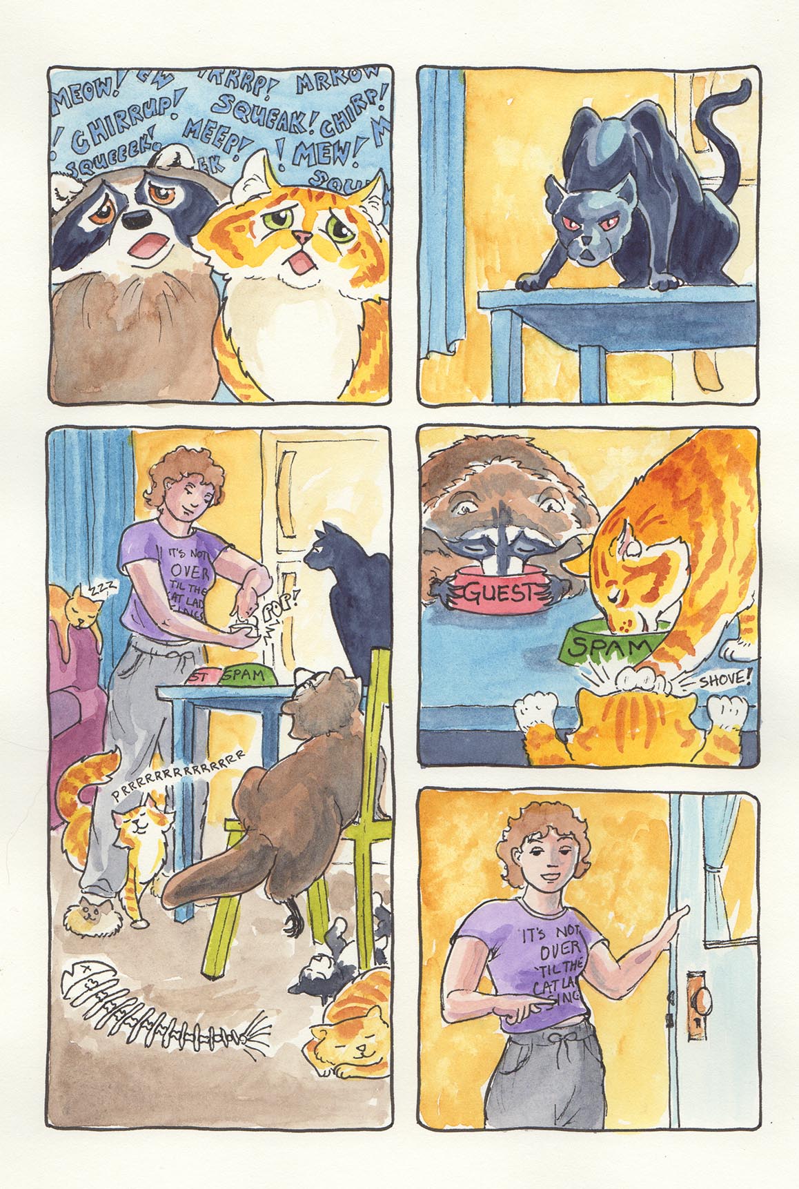So I’m going to back up a wee bit in our story and present a page that evokes warmth and homeliness enough for any cat person. Also I don’t think I’ve posted any panels with Darcy, Spam’s human mom, yet, so here she is!