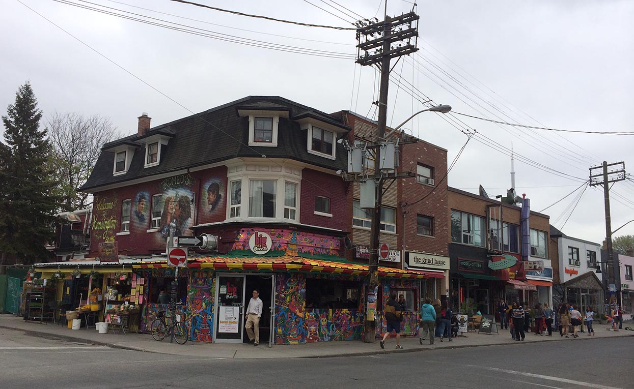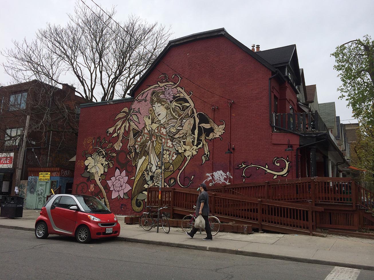 Not long after we entered the Kensington Market area, we came upon this strange addition to a porch. It seems like everyone in the neighbourhood is vying to come up with unconventional, arty things to do to their houses. Murals, colourful paint jobs, and sculptural oddities abound.