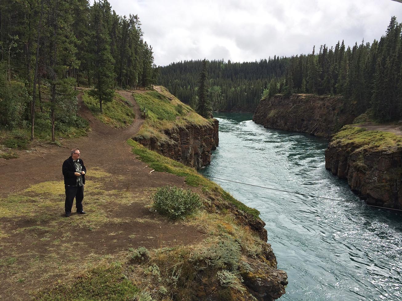 During our last few hours in Whitehorse, we got another whirlwind tour. This is Miles Canyon, which used to be the path of the rapids of the Yukon River before it was dammed. My friend Ken Steacy is kindly providing scale here.