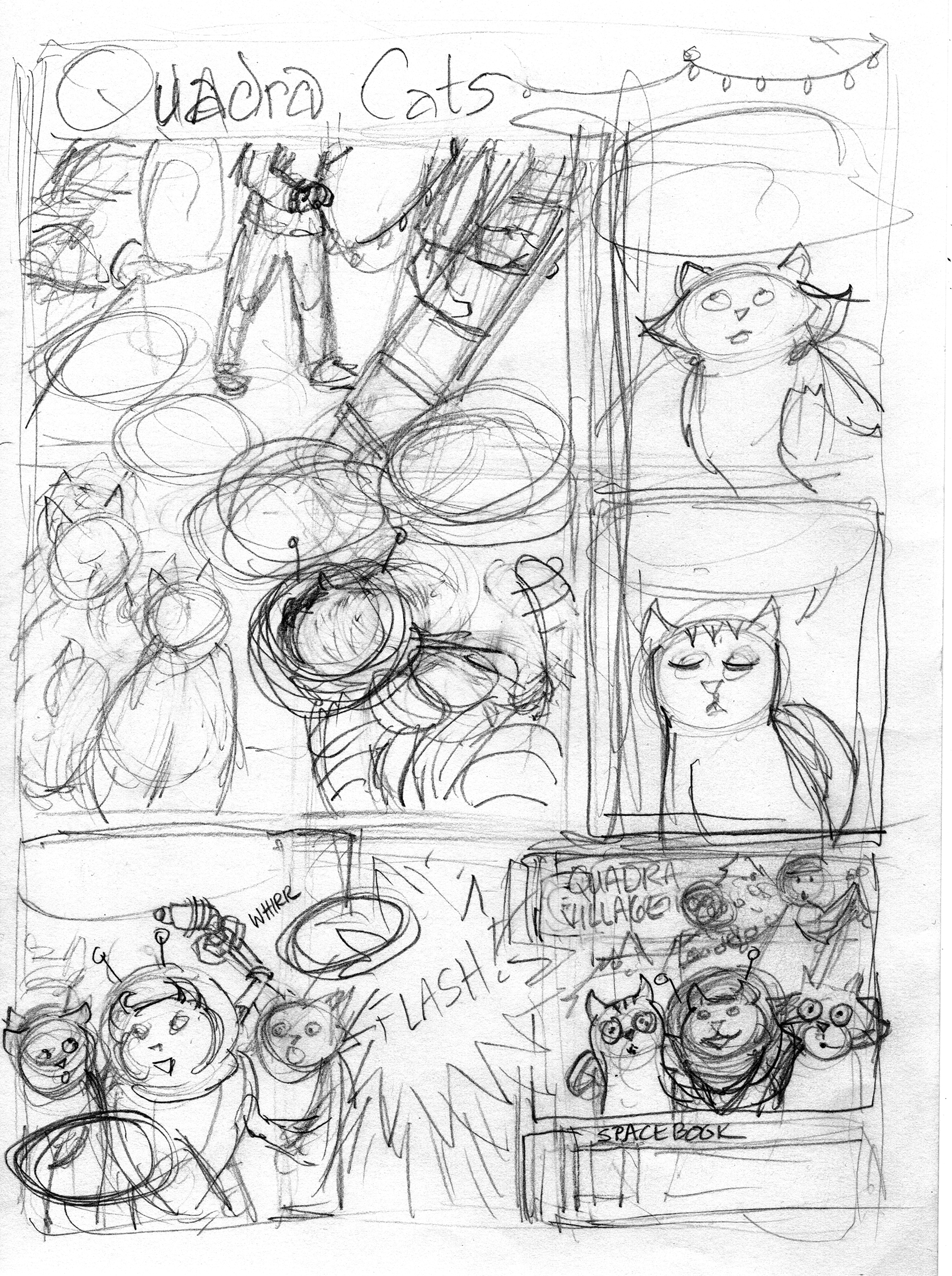 Then it was time to do a larger layout sketch (again, regular letter size paper). I decided I needed more room for the first panel, so squeezed the two side panels a little bit. That was OK, because they didn’t have much action in them. I’m conscious of leaving enough room for the dialogue, as I go, a hard won skill — it’s so easy to get carried away making pictures and forget how much space it takes for legible words! I needed more room in the bottom panels than my original 3-the-same-size layout, so I decided the “Flash!” didn’t need a whole third of the bottom tier.