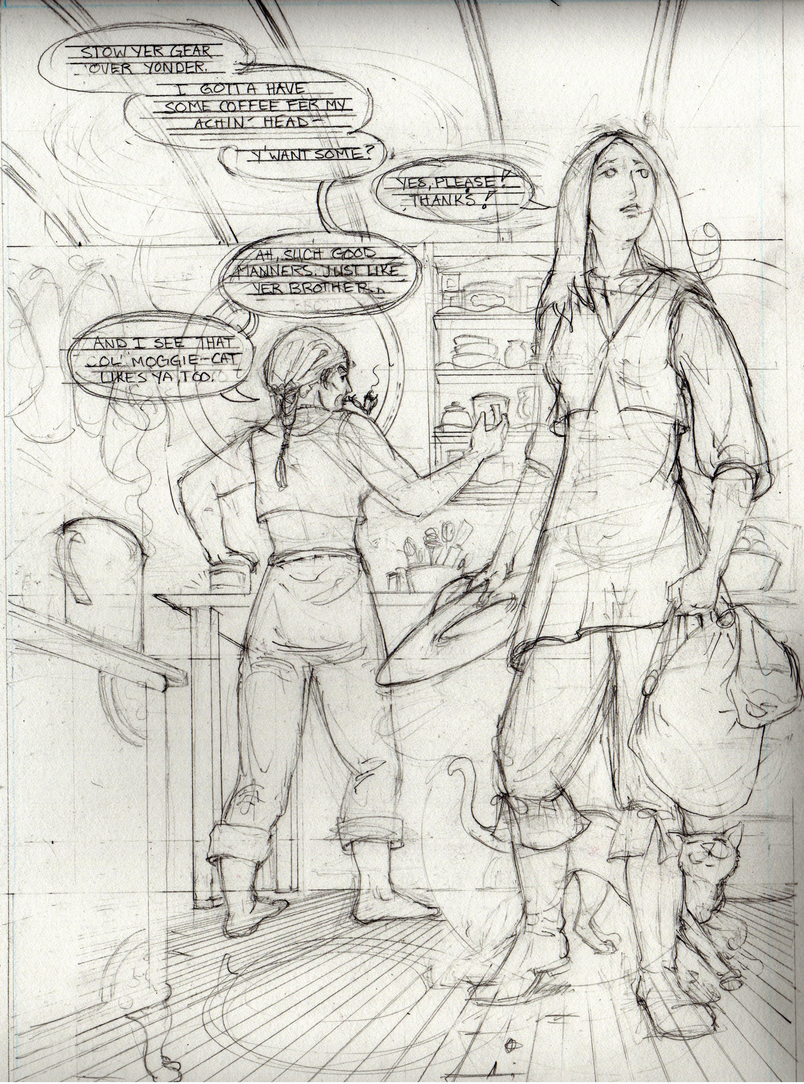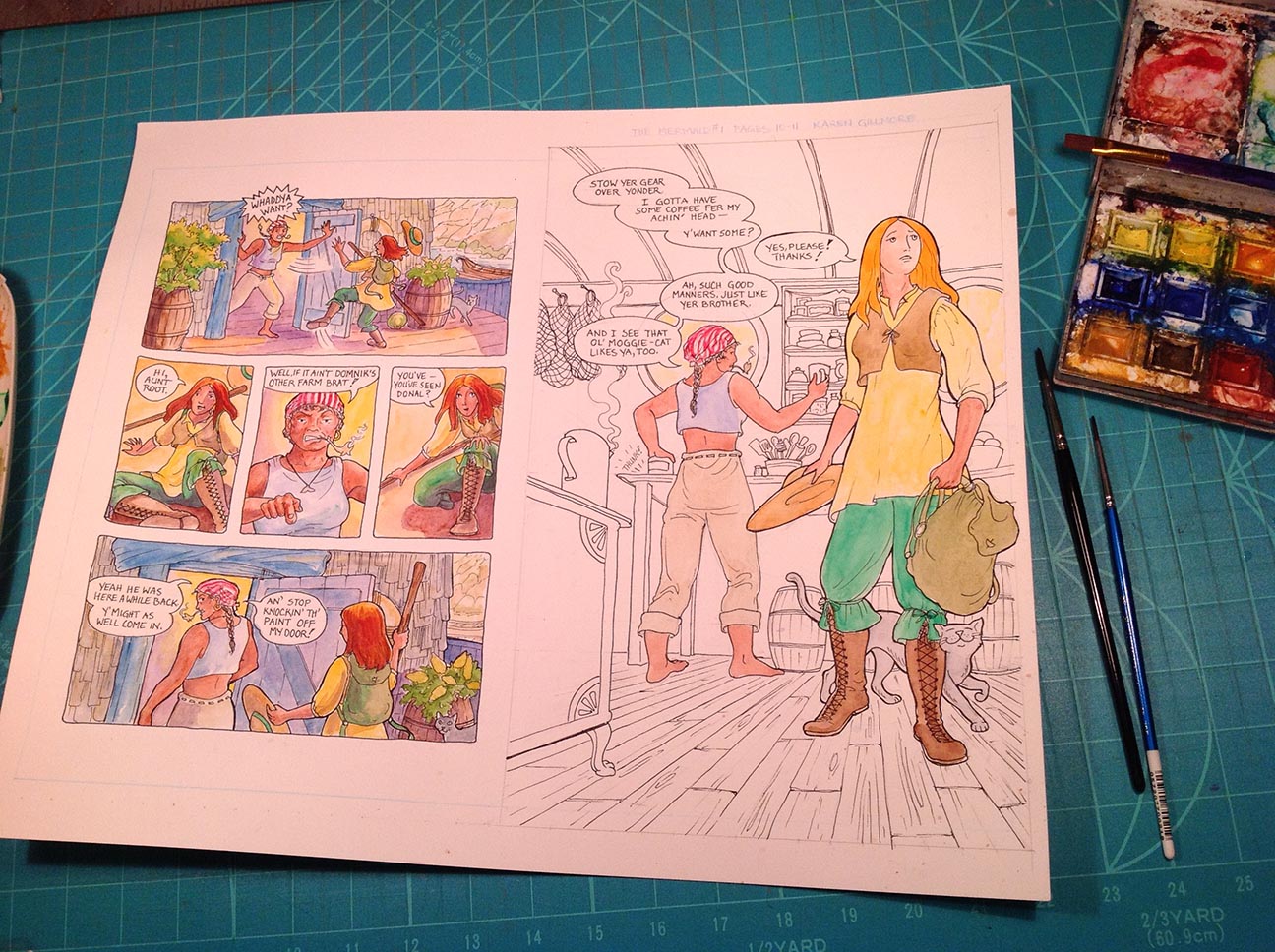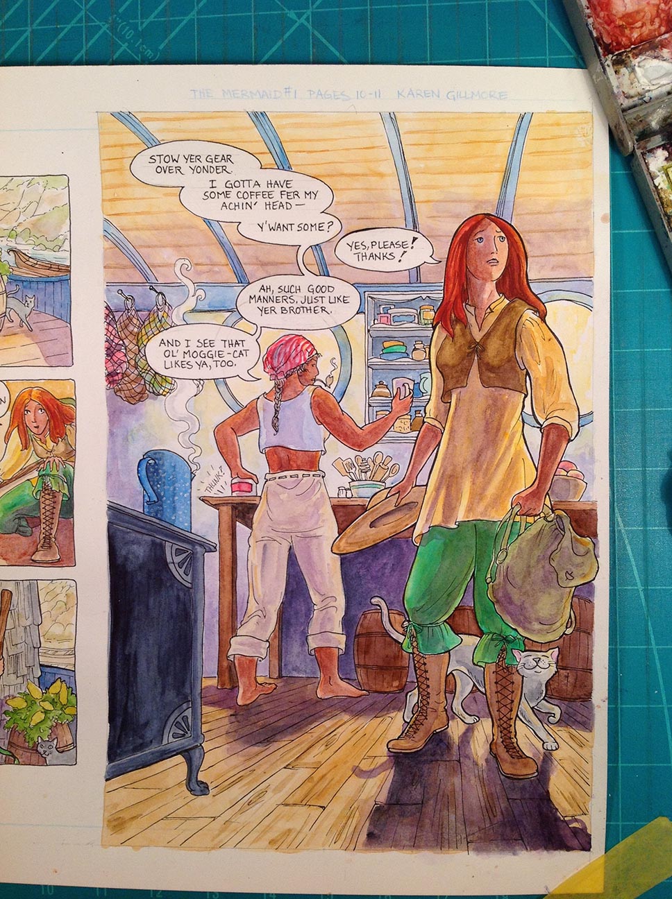 First, here’s what it looked like in pencils. I’m a really sloppy penciller, which is why I really should switch to tracing my sketches when I ink, as I did with Spam and the Sasquatch. However, the first chapter of Mermaid Music was already penciled on heavy paper (Strathmore Bristol vellum surface), so I just kept it. I’ll be changing some things for my next chapter. Only 25 more pages to go…