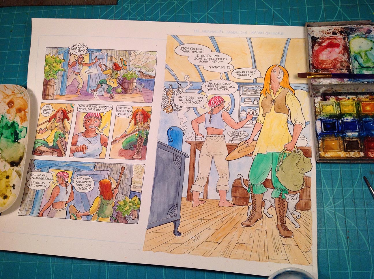People ask how long it takes me to do a page; altogether the thumbnail took about half an hour; penciling took about two and a half hours; inking about two hours; the painting part took me about three hours; another half hour to do the digital work. So that’s an eight and a half hour day, if I had done it straight through; practically speaking, I like to do a bunch of pencils, then the inks, then the colours. The scanning and digital work I usually do as I finish each page.