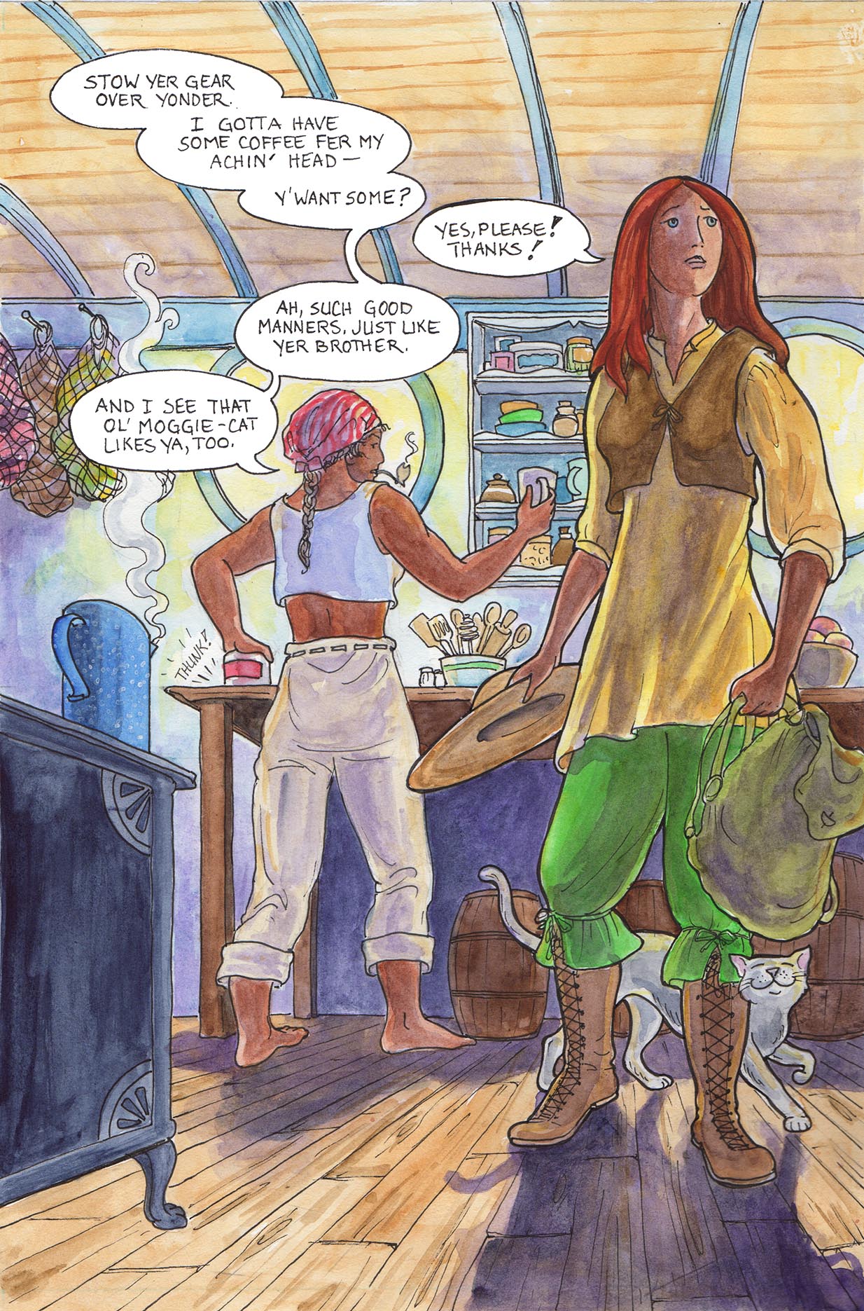 When the painting is done, my work is still not over; I scan the painting to Photoshop as a high-resolution TIFF file (for later paper publishing), and do whatever cleanup needs to be done, usually margins and balloons, but since this is a bleed I got to skip the margins (and *grumble* I had to do it twice because of my earlier visual faux-pas). I usually pump up the dark levels a bit, because my scanner seems to bleach them out a bit, and I want the colours to be rich. Then I save it as a jpeg and adjust the size so that it won’t be a huge file and take up all my expensive WordPress storage space. Then I load it up to the Mermaid Music blog (I’m using a WordPress theme called Panels, specially made for comics), choose my tags, put in the chapter and page and a little caption, and it’s done.
