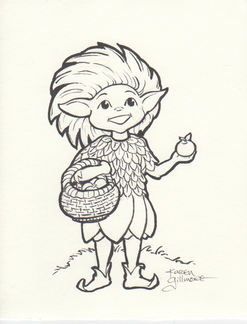 October 10 — It’s Thanksgiving weekend here in Canada, and the beginning of advance voting for the federal election. So between going out to vote and beginning the pumpkin pies, I found myself short of time again. I decided another little elfin character would be fun, and this little apple sprite appeared on the paper!