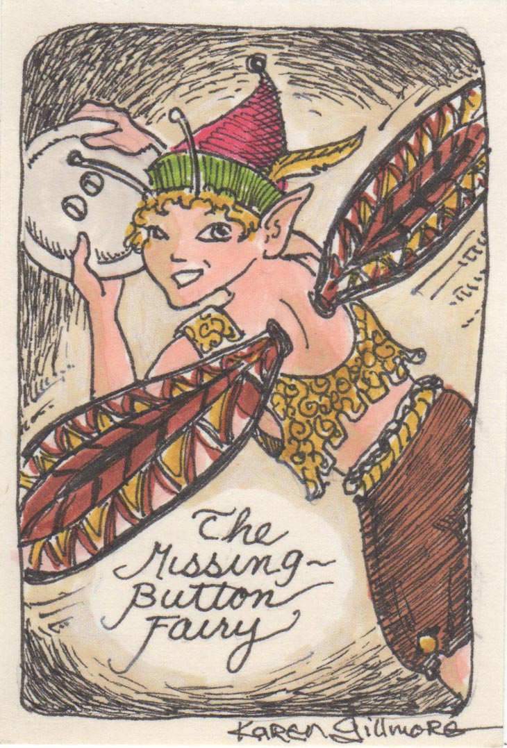 October 11 — I spent all day cooking! But had just enough time to do this recap of the Missing Button Fairy, which I originally drew as a tiny sketch card.