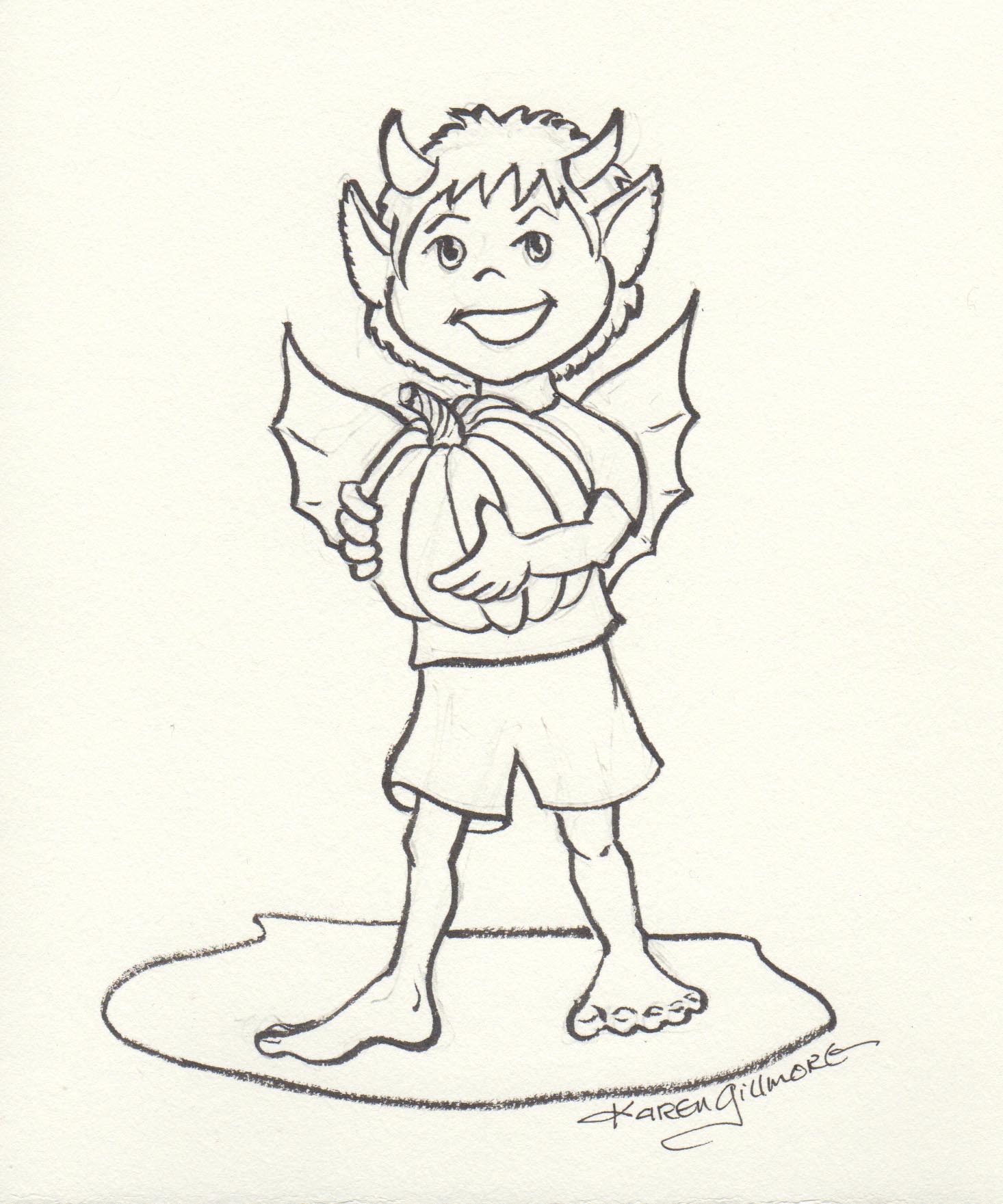 On October 5th, I was finishing up a big digital colouring project (which I hope to be able to post about soon), so I needed to make something simple and quick. It was nice to get away from the computer and draw on real paper! The subject of imps came up in conversation, and so I drew an inktober imp — with a seasonal veggie.