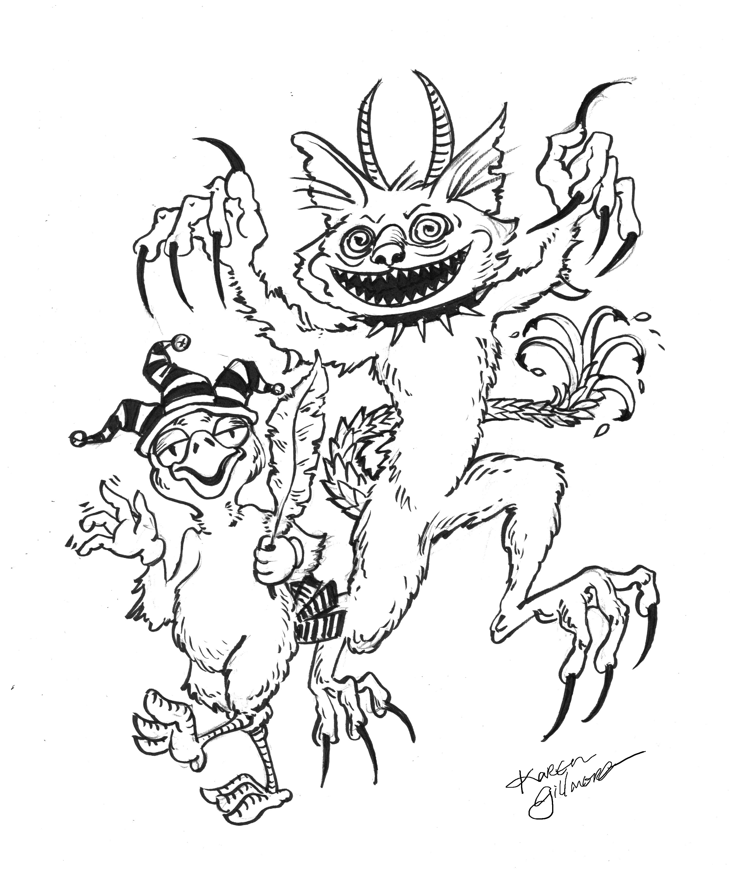 Usually, when entertaining these kinds of visitors, I can take them up to the studio and make them listen to music while I draw stuff. I find it a comforting and productive way to distract myself from unwelcome company. But this horde was not going to let me do that; they sat on me and took turns regaling me with bad jokes, dreary stories, and their loud cacophonous music. Fortunately my old friend Lozengia showed up, or I don’t know what might have happened.