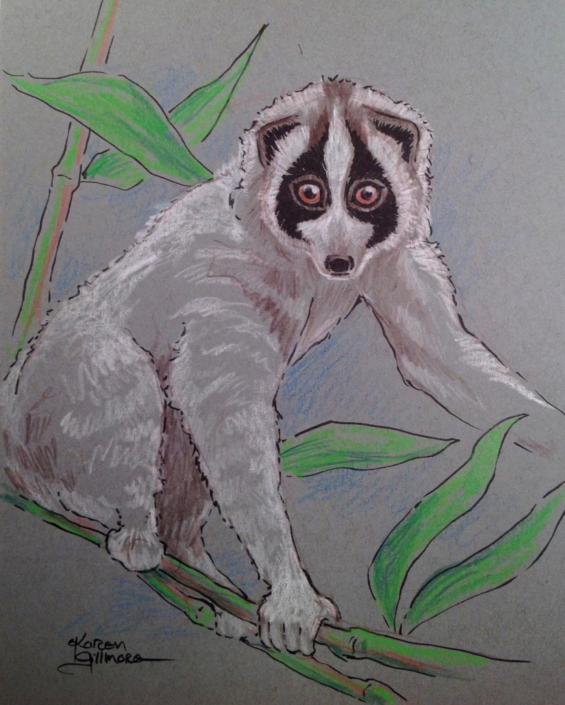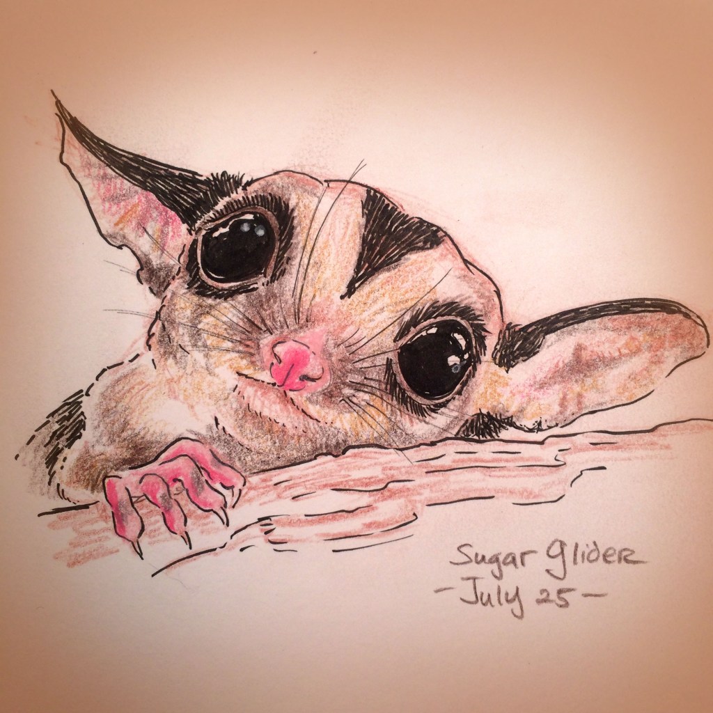 Coyote — I toned several sketchbook pages with gouache to see what it would be like working on a background like that. Oddly, I found it harder to get started on the primed page than a blank page. It was so pretty all by itself that I had to sneak up on it by sketching with a similarly coloured pencil! This was also an experiment to see how coloured pencils would work on this kind of background; they worked beautifully..A very smug crocodile. Ink and coloured pencil. All these animals are done from photographs, many of them from the internet. Sometimes I work from several at once, or even look at videos so I can get an idea of how a creature is made from different angles. I could have gone nuts here with the detail of the crocodile’s skin, but had a time limit, so went more for a general impression. A Toco Toucan. Our prompt for the day was “toucan”, and once I got to looking, it was really hard to choose — so many beautiful types! I used ink and watercolour pencils for this one.A wee Sugar Glider. How could I resist that pink nose and big black eyes? This is a very tiny drawing, about 3×4″, using ink and coloured pencil.A quick sketch of a Slow Loris – an incredibly cute little primate whose numbers are being decimated by the illegal pet trade. Not strictly from my sketchbook; this was on a separate piece of toned paper, a good way to start if you want to create a richly coloured drawing in a short time. I started with the ink outline, then scribbled in the lights and darks with coloured pencil. The result uses the paper itself for the midtones.