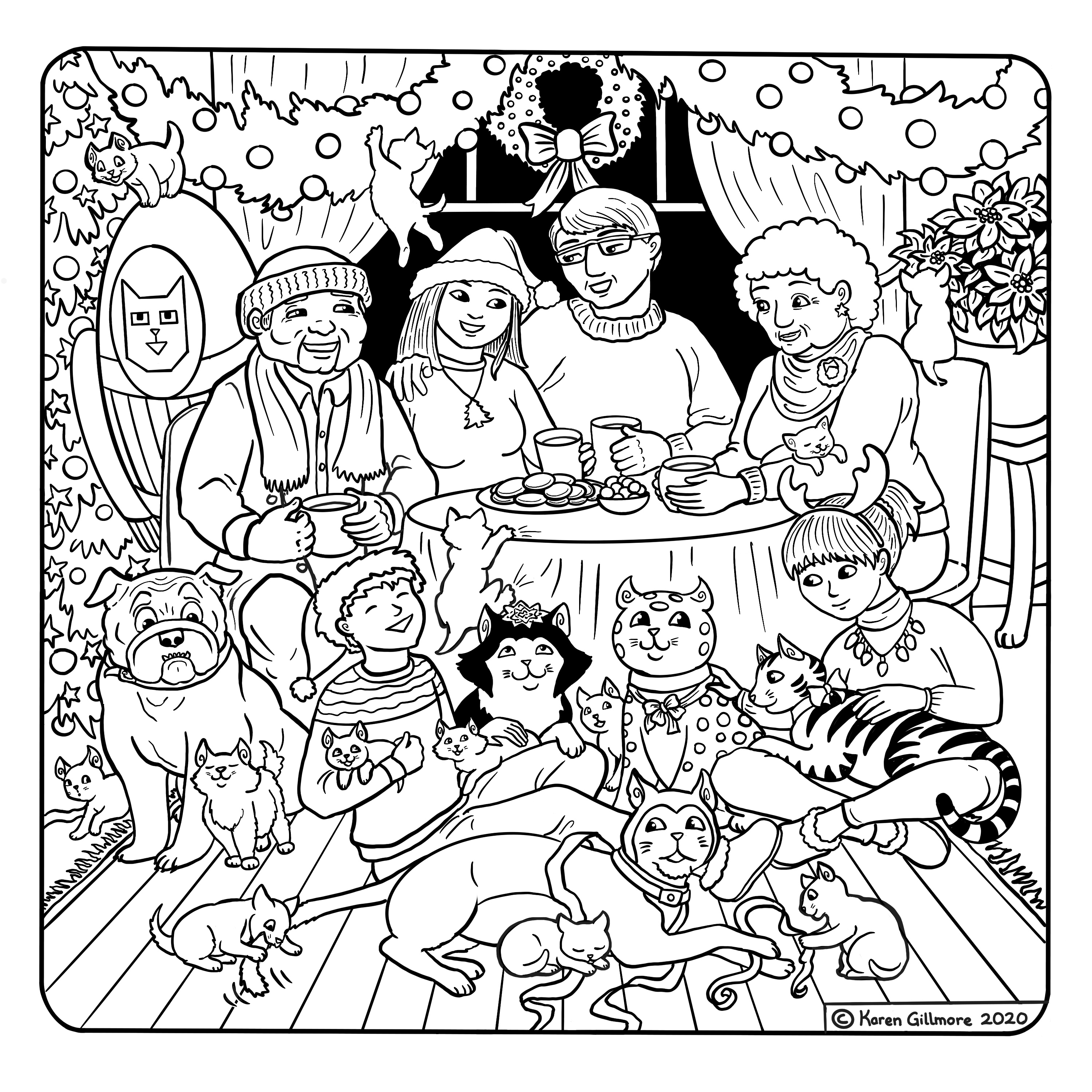 The story is from the viewpoint of Alien Cat, whose journal excerpts are frequently featured on the webcomic. He is an incorrigible entrepreneur, and has big plans for his takeout-delivery and tourism empire. Aided by MOLLY-unit, a feline ship’s AI (artificial intelligence), he has made friends with some Earth cats, who have become his partners in the Takeout Planet (AKA Earth) franchise. If this sounds like fun to you, go read the webcomic! But first, here’s the colouring page, and the story of Galaxy Day.