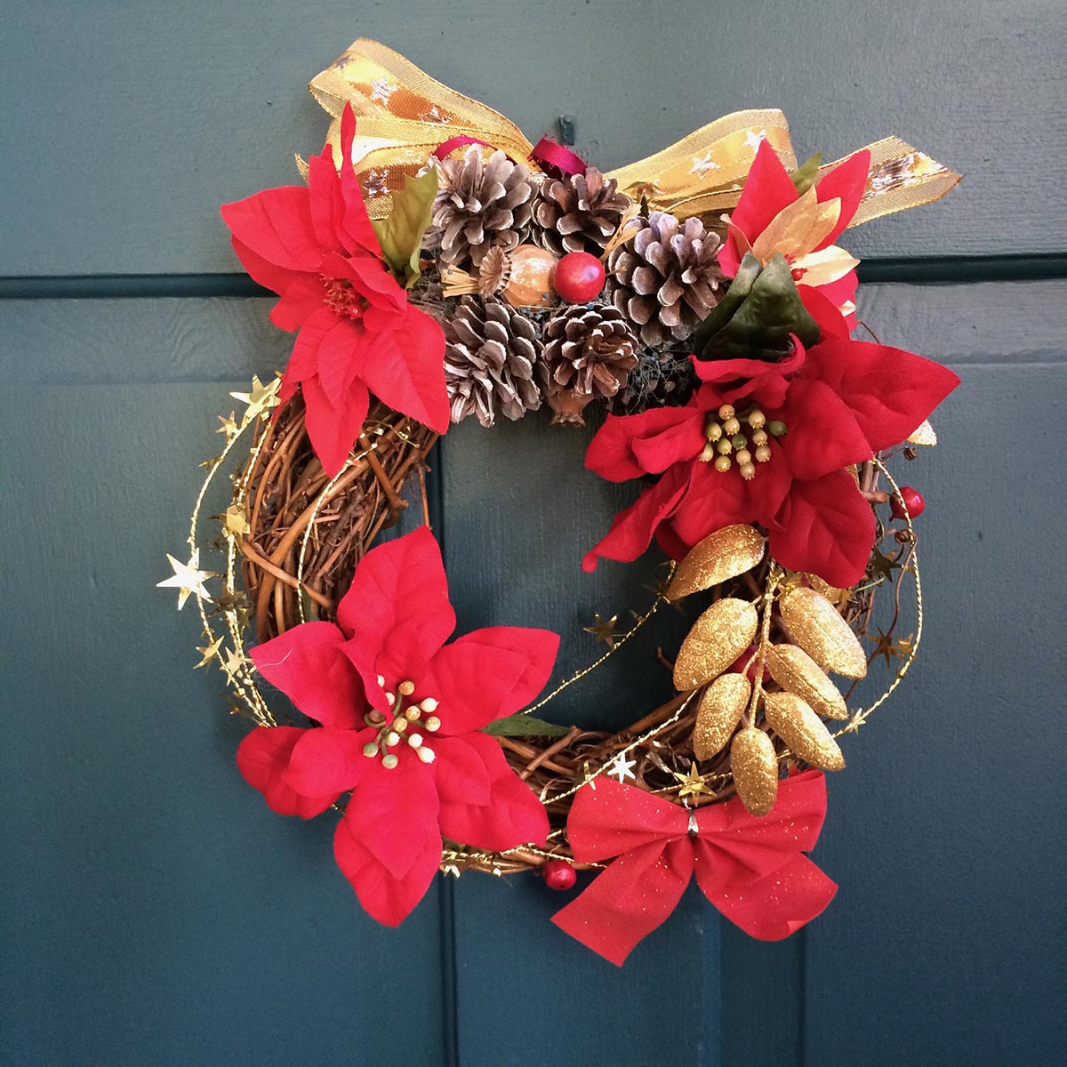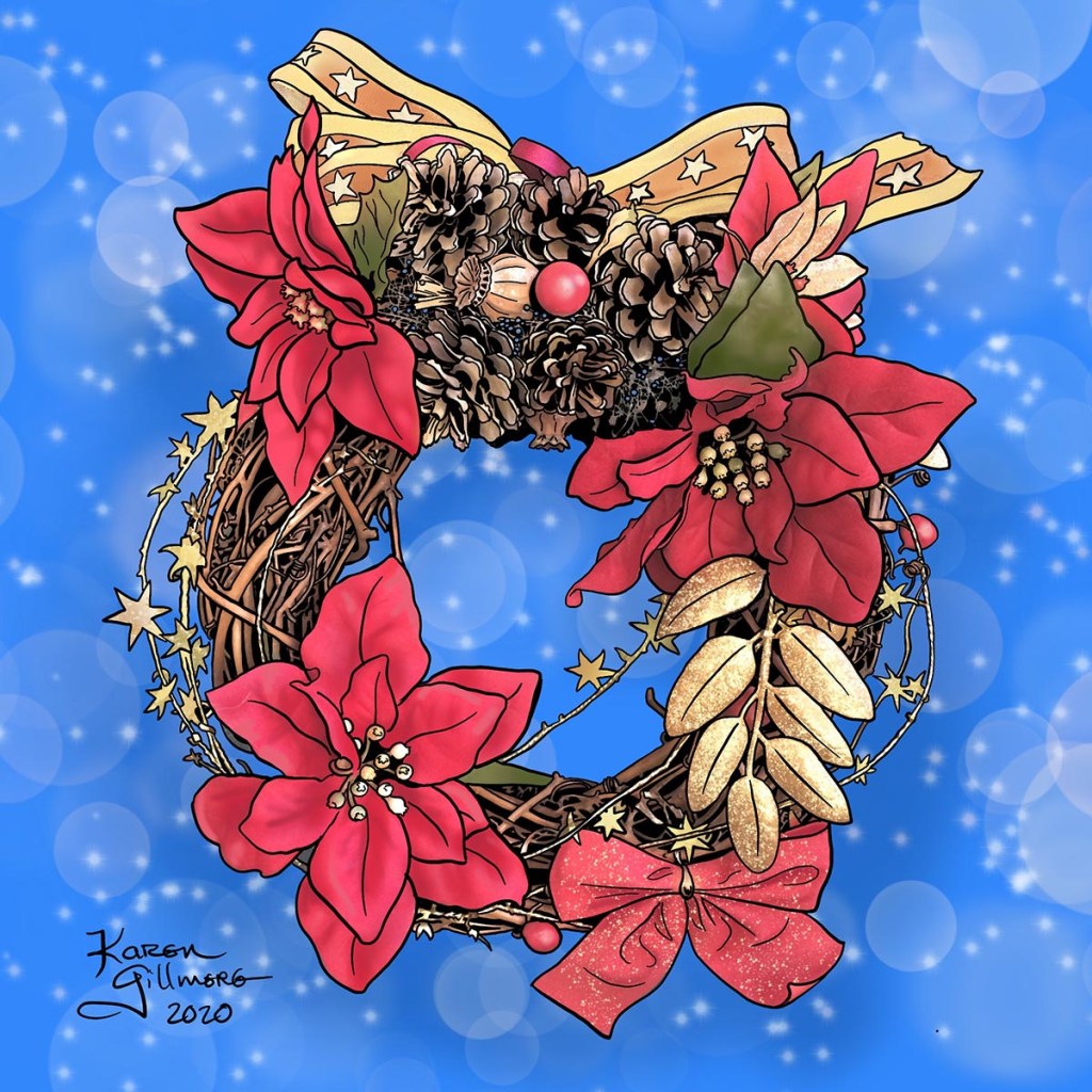 Anyway… I pulled up that photo of the wreath, started doodling, and this is what I eventually came up with. I left elements of the photo poking through, while colouring over the background and places where the original photo colour was too busy. This was not a fast process; I nibbled away at it for many days before I was satisfied. It made a nice break-time project, though, kind of like having a big puzzle to assemble, all laid out on a handy card table. With the advantage that the cats couldn’t knock this awry. Want to try it? Read on!