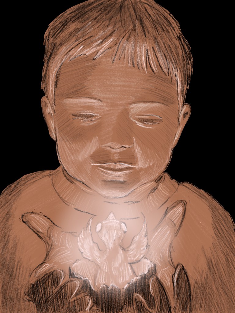 I had also decided I’d be working in my sketchbook, but I got tired of that too — so I switched back and forth between sketchbook and Procreate on my iPad. Which was just as well, I needed the variety and to stretch my digital skills a bit too. The little fellow with the baby Phoenix above was done entirely digitally, even though it looks like pencils on coloured paper; really the techniques are not that different!