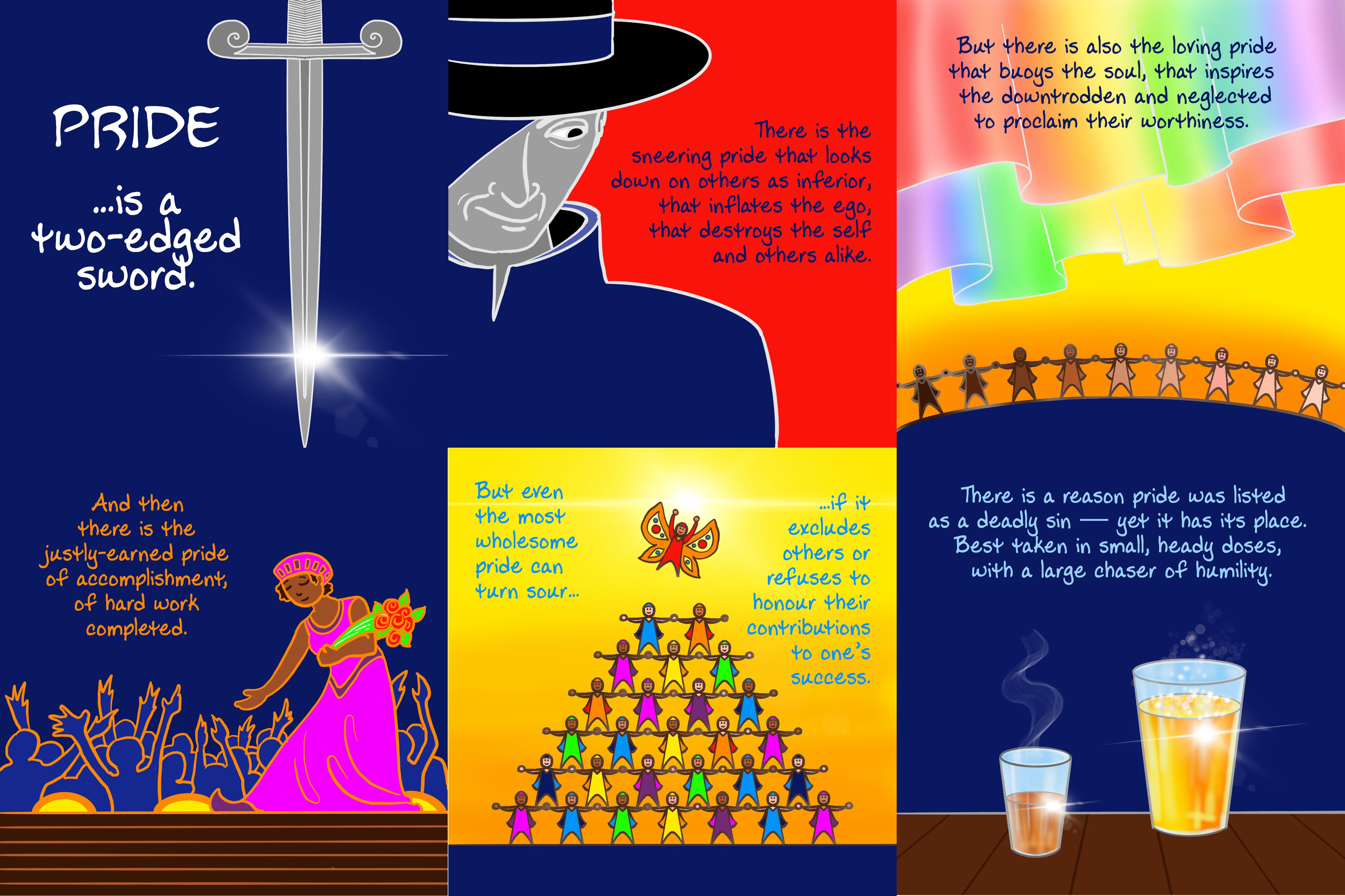 This simplifying led to making a multi-panel exploration of the philosophical implications of the word “pride” — I forget how it came about, but there was a conversation I was involved in on Facebook which caused me to write a short essay on my thoughts around the subject, which then of course needed to be illustrated!