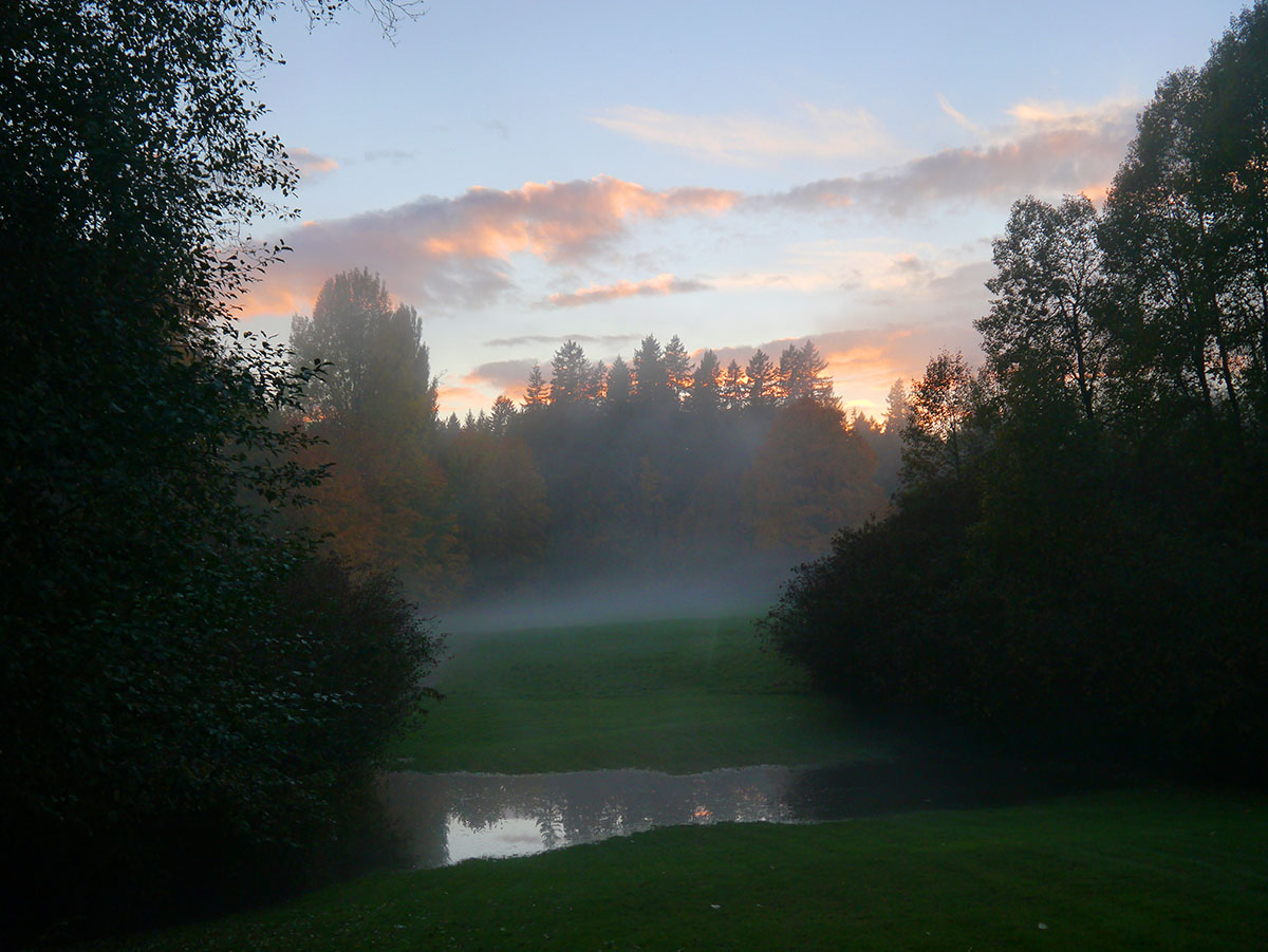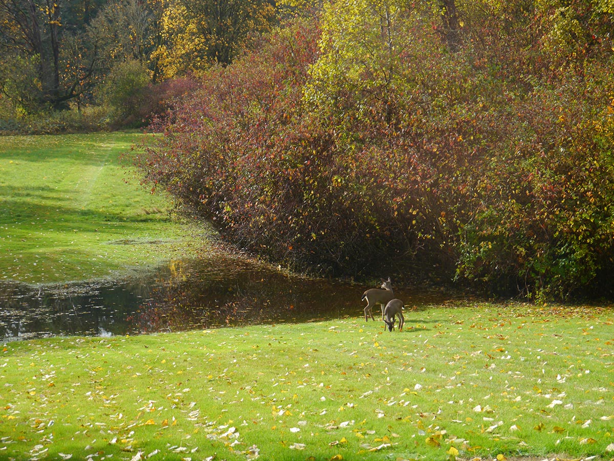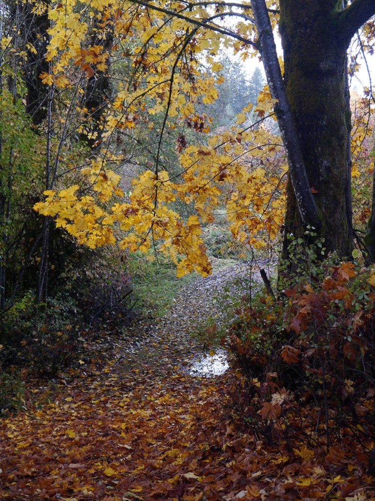 The day after the retreat started, there was a huge storm that lasted for days. We all made sure we had extra water stashed, checked our flashlights, and kept on writing, counting it as a bonus that kept us from being distracted by all that beautiful nature out there. The electricity did go out a couple of times, but was back on quickly. The puddle in the backyard turned into a lake, and the ducks came to swim in the relative calmness of its waters. The river by this time was chomping at the edge of its banks and truly raging! By the time the storm had cleared, most of the colourful leaves were on the ground rather than the trees.