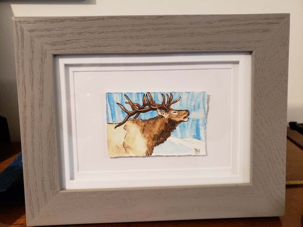 Speaking of their setting, when it’s time to frame them, give them some space — don’t cram them into a tiny photo frame. My friend Greg purchased the Elk, and sent me this picture of how he had framed it. I think it’s a gorgeous job, and asked him if I could post the photo (he said yes). The edges on these paintings are torn using a knife; I think they look best floated, as Greg did here.
