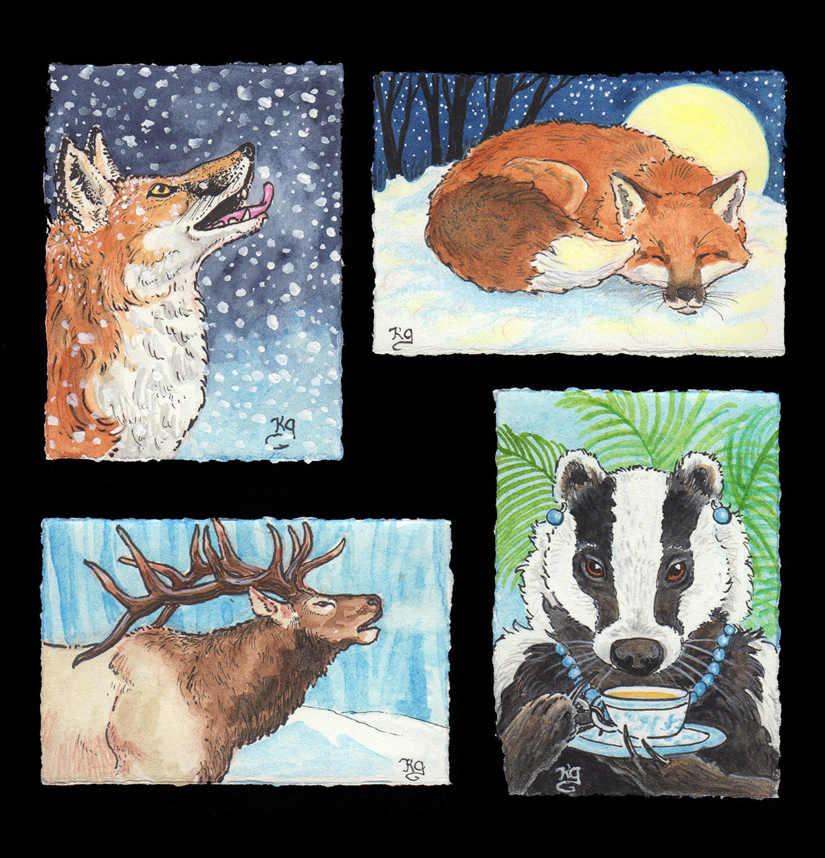 Oddly, this time, I found myself doing a horizontal format more often than the vertical, which made it hard to arrange these in sets of four for this post! I tried experimenting with some different styles, from decorative, to comic-y, to as realistic as I could cram onto these little pieces of paper.