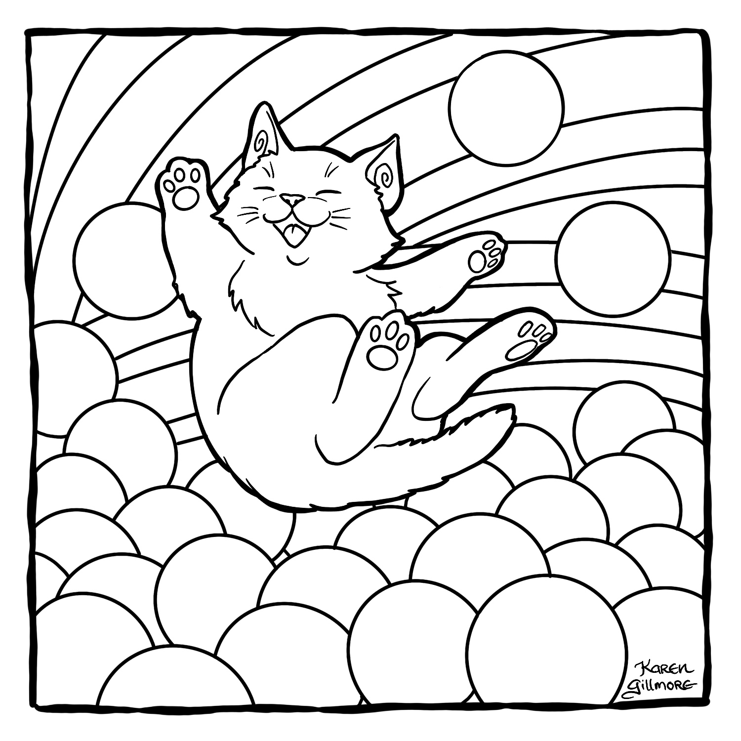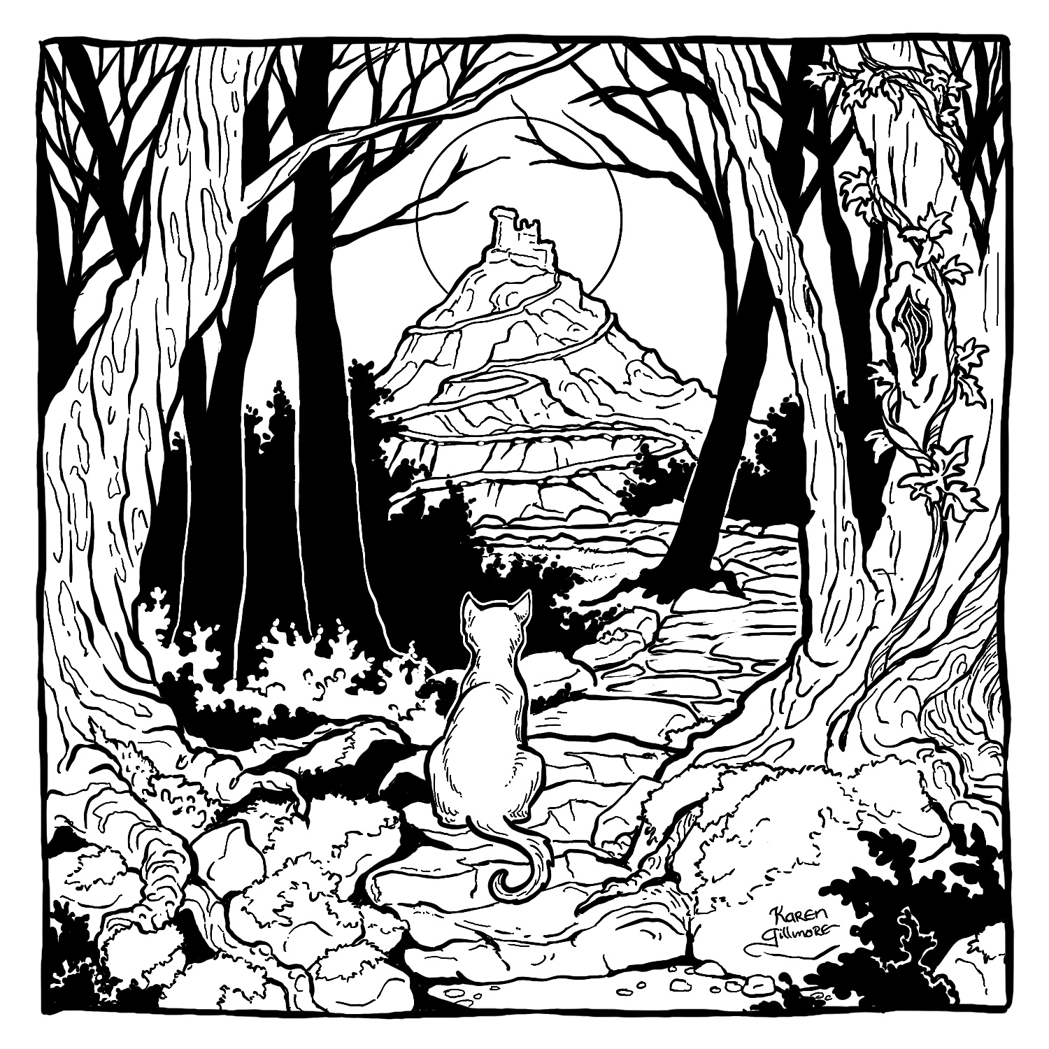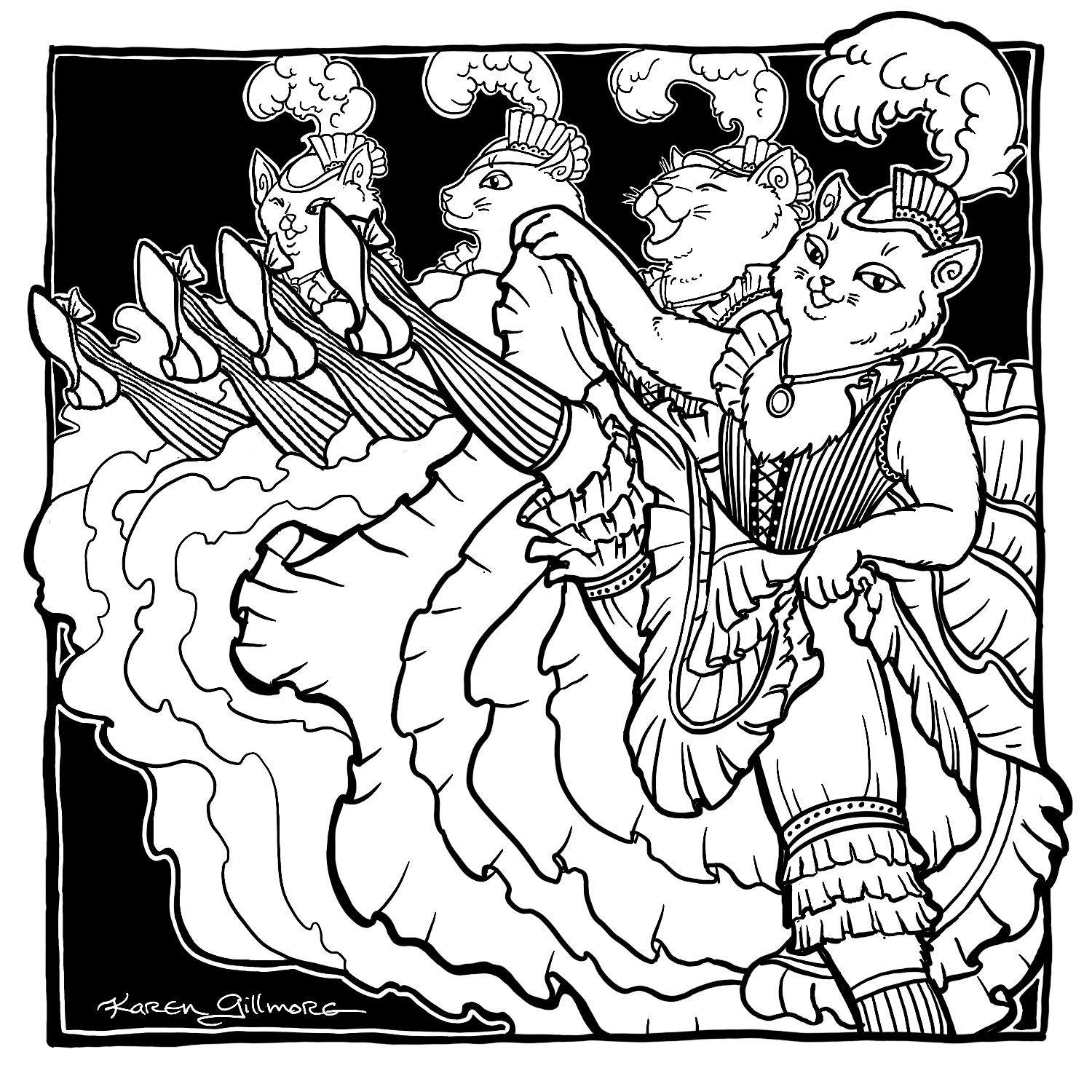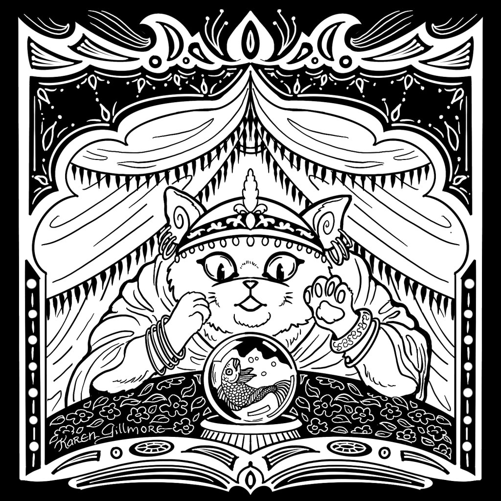 “Dream” – what do cats dream about? I don’t know, but mine twitch their paws and meow and make cute little groans. I can only speculate.“Spiders” — two pals, dressed up as each other. How ’bout those little cat booties, eh?“Path” — this kitty has a long way to go. I wonder if dinner’s waiting when he gets to the top?“Dodge” — Here are two cats who refuse to get the heck out of Dodge!“Map” – of COURSE there’s a volcano. There’s always a volcano.“Golden” — I was wracking my brains over this one. I did a search for “golden cat” in case there was a breed or species, and there was, but a golden maneki-neko caught my attention, and then of course I had to draw one of those.“Toad” – there was the sorcerer’s apprentice, and then there was the witch’s familiar…“Bounce” — one of the few drawings in this series in which I made extensive use of Procreate’s ability to draw nice, tidy circles and curves.“Fortune” — I’ve always thought that crystal balls looked a bit like fishbowls. This one made use of Procreate’s ability to draw in symmetry. It can be turned on and off, so that I only used it for the border.“Wander” — based on an earlier drawing I had done in colour. “Spicy” — Look, I just wanted to draw some cat can-can dancers, OK? And actually ended up spending the entire evening reading about (and watching on youtube) can-can, Toulouse-Lautrec, and the Moulin Rouge.“Castle” — a natural for cats. I’ve alway wanted to build a cardboard one for my kitties, but there’s no room with all their other toys!