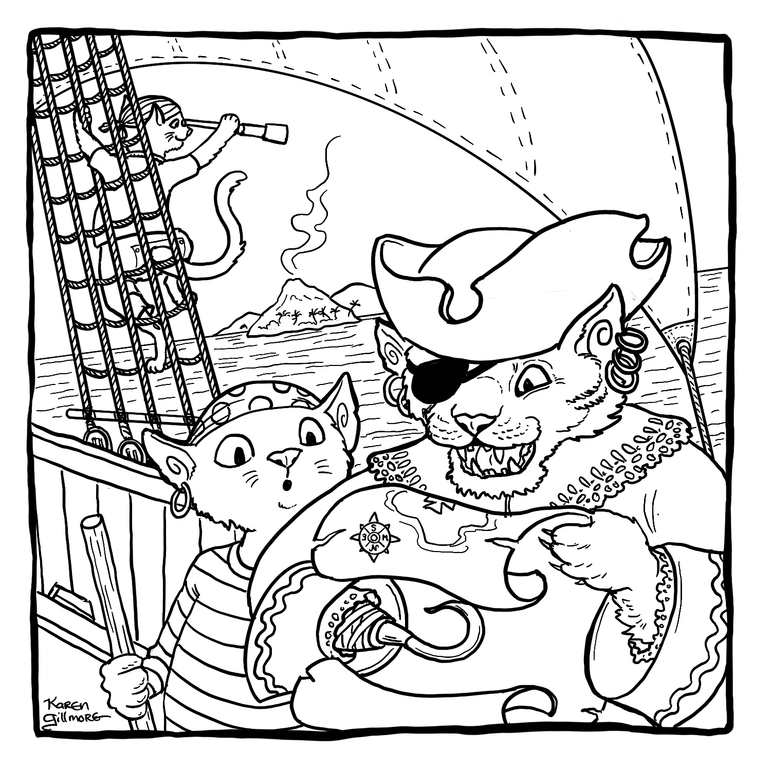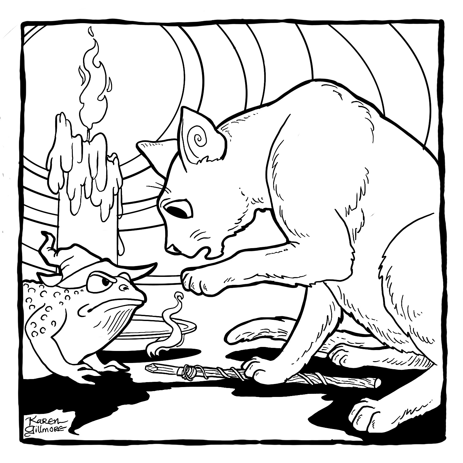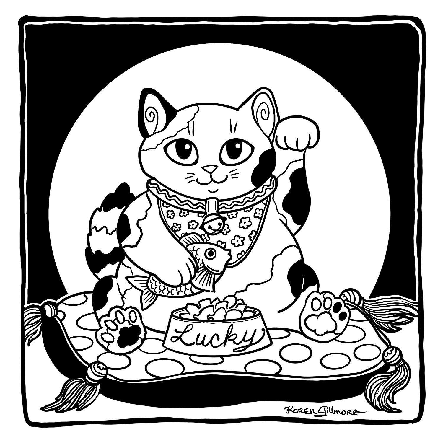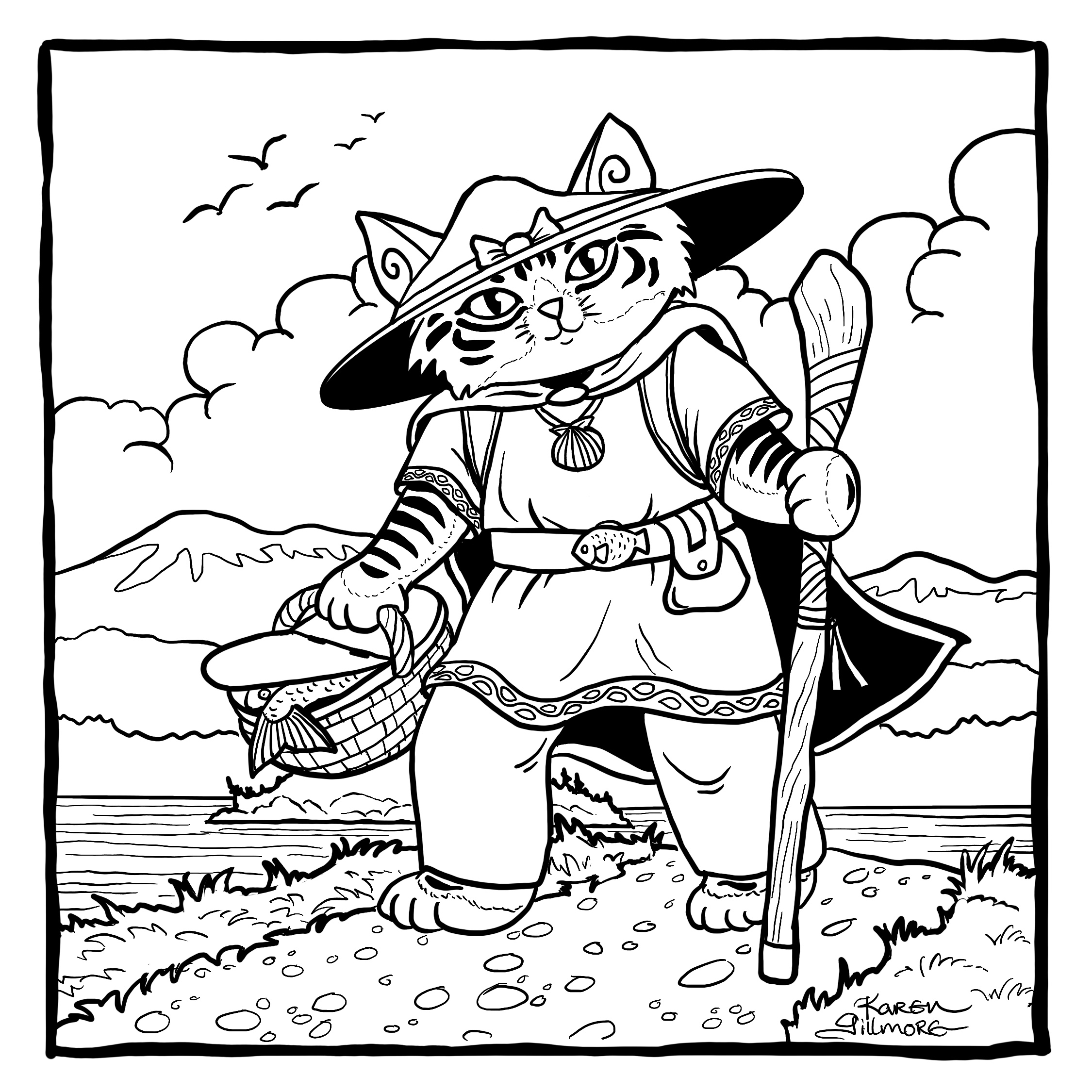 “Dream” – what do cats dream about? I don’t know, but mine twitch their paws and meow and make cute little groans. I can only speculate.“Spiders” — two pals, dressed up as each other. How ’bout those little cat booties, eh?“Path” — this kitty has a long way to go. I wonder if dinner’s waiting when he gets to the top?“Dodge” — Here are two cats who refuse to get the heck out of Dodge!“Map” – of COURSE there’s a volcano. There’s always a volcano.“Golden” — I was wracking my brains over this one. I did a search for “golden cat” in case there was a breed or species, and there was, but a golden maneki-neko caught my attention, and then of course I had to draw one of those.“Toad” – there was the sorcerer’s apprentice, and then there was the witch’s familiar…“Bounce” — one of the few drawings in this series in which I made extensive use of Procreate’s ability to draw nice, tidy circles and curves.“Fortune” — I’ve always thought that crystal balls looked a bit like fishbowls. This one made use of Procreate’s ability to draw in symmetry. It can be turned on and off, so that I only used it for the border.“Wander” — based on an earlier drawing I had done in colour. “Spicy” — Look, I just wanted to draw some cat can-can dancers, OK? And actually ended up spending the entire evening reading about (and watching on youtube) can-can, Toulouse-Lautrec, and the Moulin Rouge.“Castle” — a natural for cats. I’ve alway wanted to build a cardboard one for my kitties, but there’s no room with all their other toys!