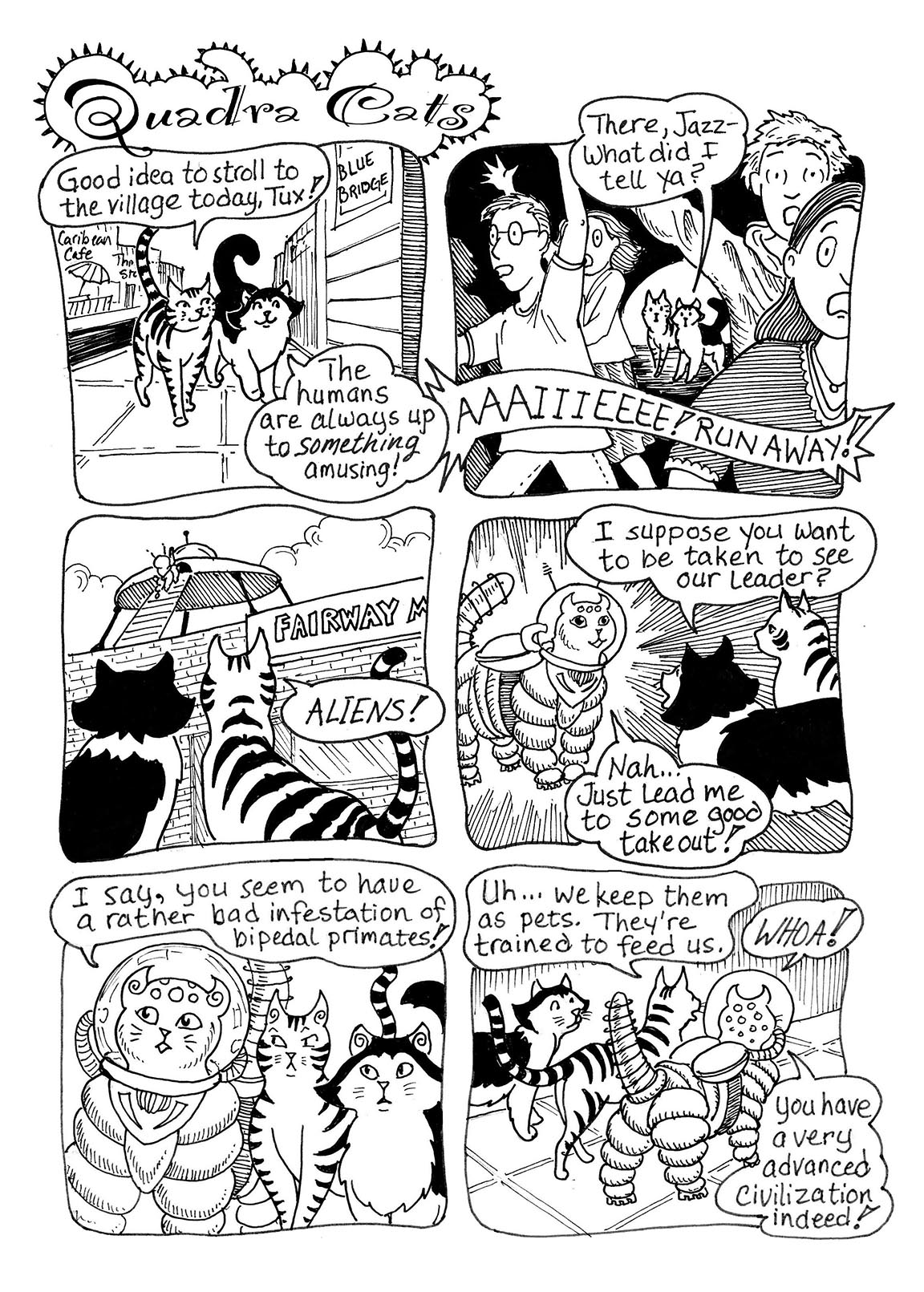 Here are the original strips from the newspaper, in case you’d like to compare them to the webcomic/books — there is one that was omitted from the book because I couldn’t fit it in the narrative, and a couple that I’ve done since then. My style of drawing the cats has evolved a lot since the first early strips — this is vintage Quadra Cats!