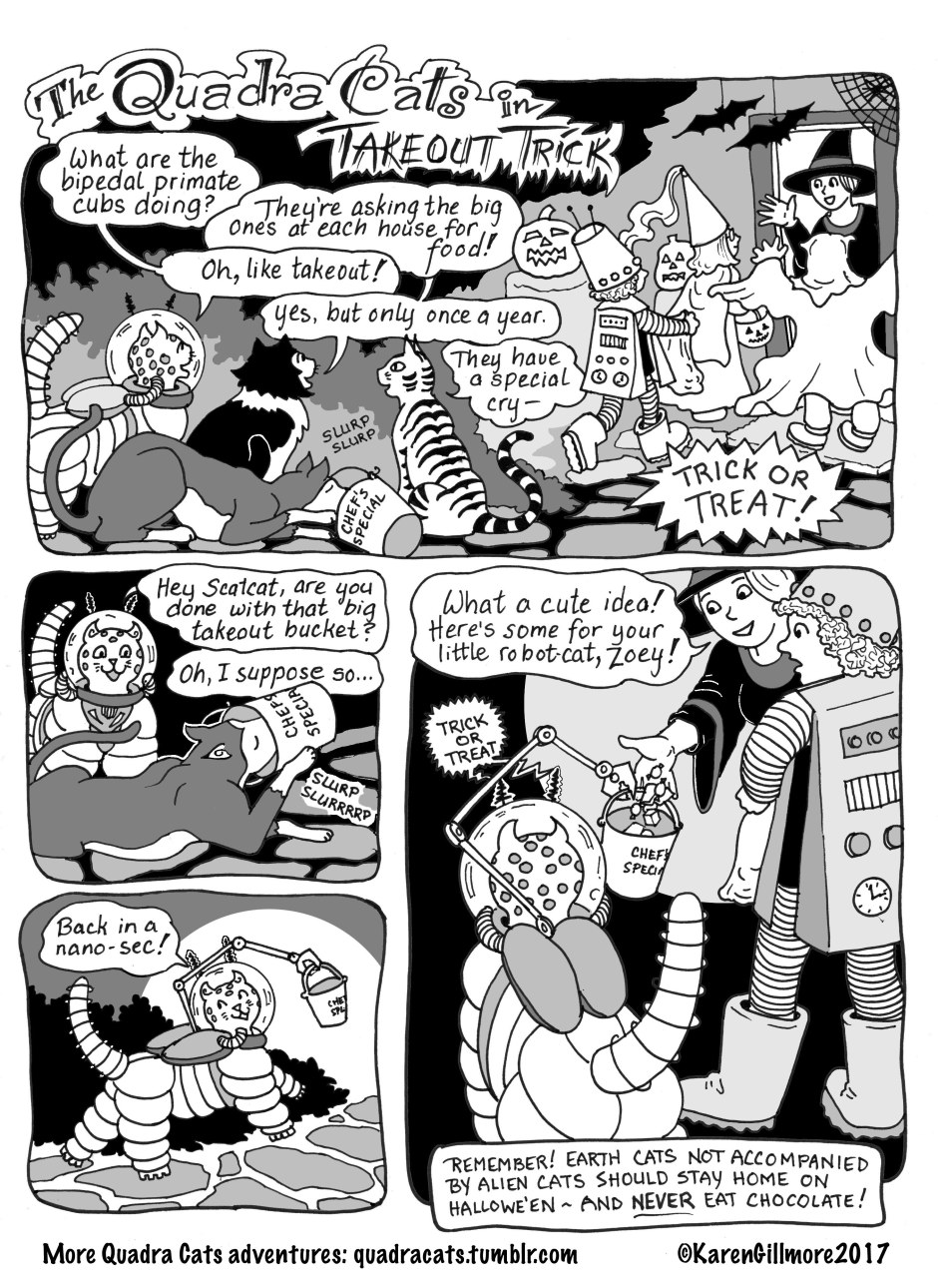 In 2014, a friend who works on a local neighbourhood newspaper did an interview about me for the paper, and asked if I would be willing to draw a comic for the paper, which comes out quarterly. I said yes, and the Quadra Cats were born. The first strips were all in pen and ink, and I eventually gathered them together, stitched together with some extra panels and whole pages, to form a continuous narrative which became Takeout Planet. There are now three books in print, a fourth in the works, and a webcomic. They also have their own Facebook page, and are starting to receive fan art!
