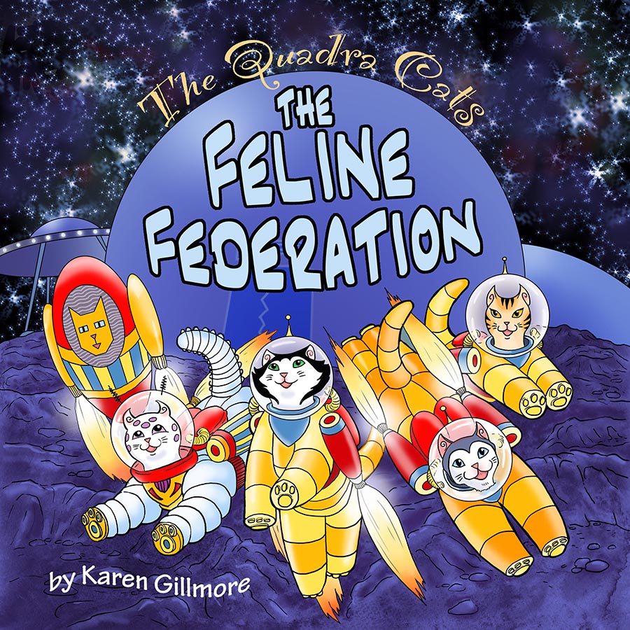 I had been waffling for a while over offering the stories as a webcomic, and in February 2017 I was in a fey mood and just decided to do it. The two books were done and ready to post, so why not? Weeeellllll… maybe because I already had another webcomic going? Obviously, cooler heads did not prevail here! It’s been an adventure trying to keep up with them both, but both stories are growing (UPDATE: Mermaid Music, the other webcomic, has been paused indefinitely). The next book is a direct sequel of Spaced Out, wherein the Cats encounter the joys of interstellar bureaucracy: The Feline Federation. The book was released in 2018.