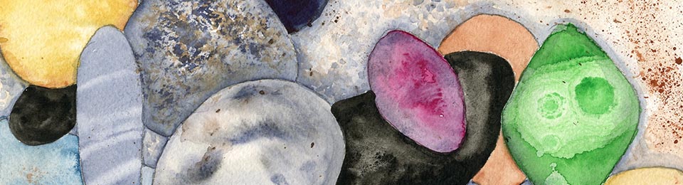 One of the exercises I give in my classes is to try out different techniques on overlapping ovals — the result is a bunch of colourful beach pebbles!